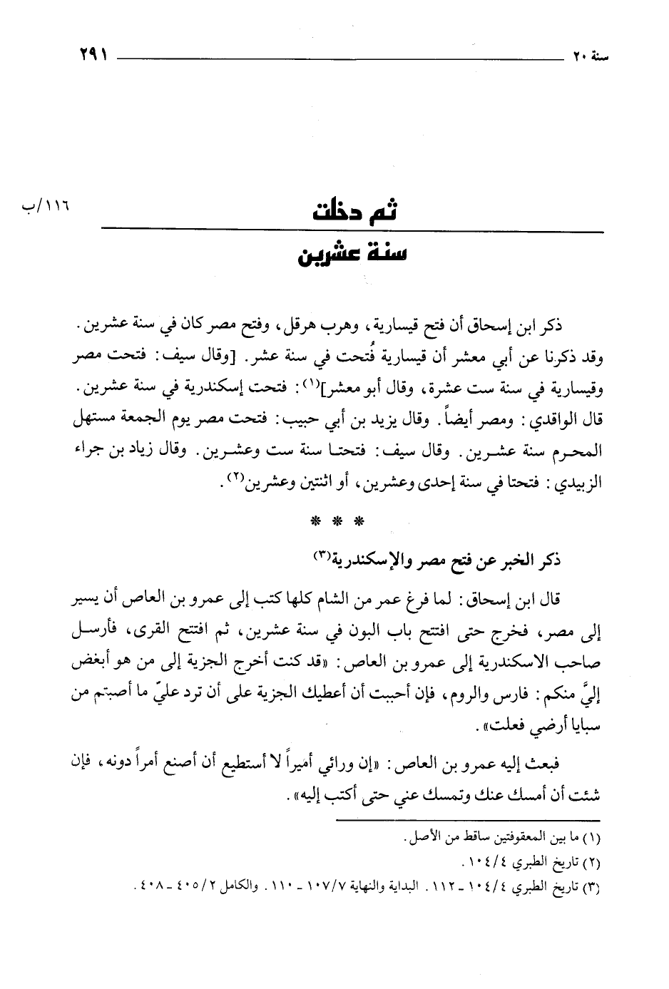ذكر ابْن إِسْحَاق أَن فتح قيسارية، وهرب هرقل، وفتح مصر كَانَ فِي سَنَة عشرين.