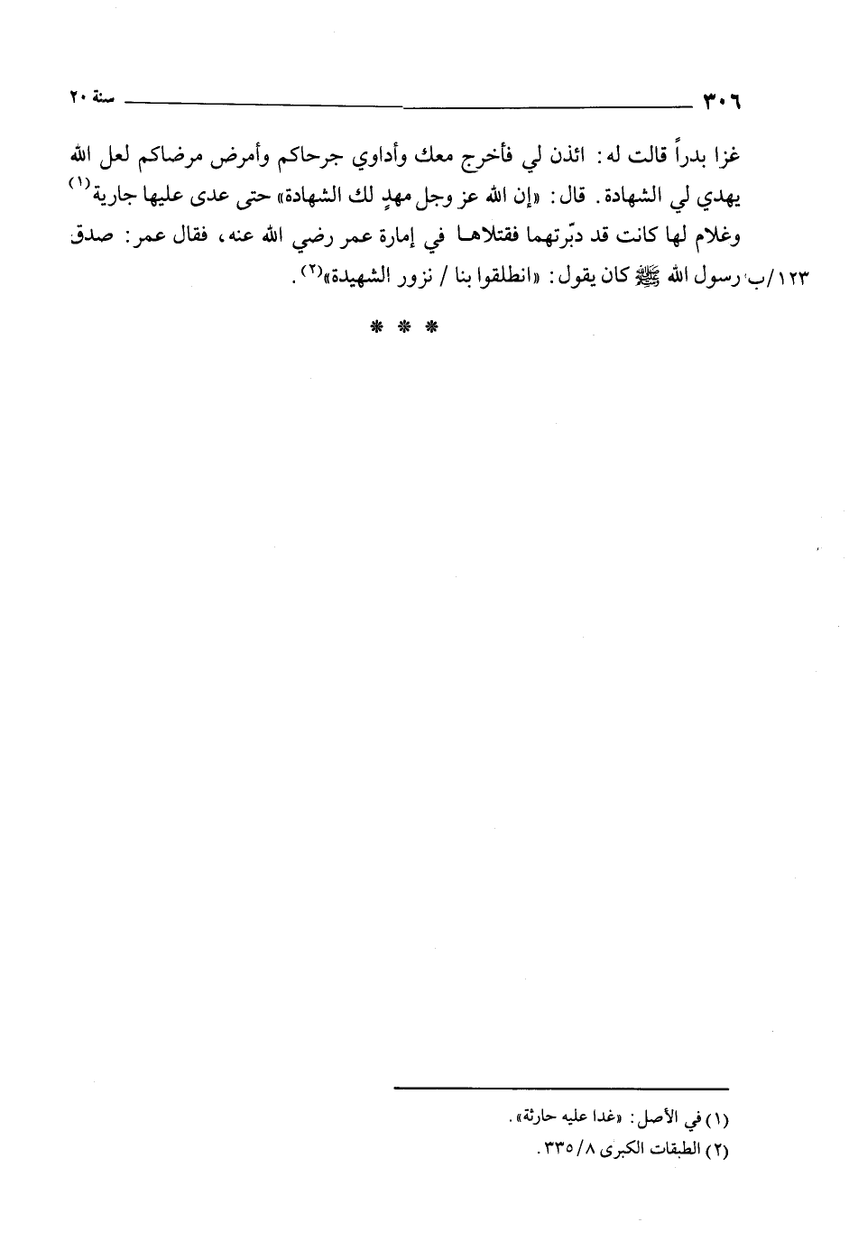غَزَا بَدْرًا قَالَتْ لَهُ: ائْذَنْ لِي فَأَخْرُجُ مَعَكَ وَأُدَاوِي جَرْحَاكُمْ وَأُمَرِّضُ مَرْضَاكُمْ لَعَلَّ اللَّهَ يُهْدِي لِي الشَّهَادَةَ. قَالَ: «إِنَّ اللَّهَ عَزَّ وَجَلَّ مَهَّدَ لَكِ الشَّهَادَةَ» حَتَّى عَدَّى عَلَيْهَا جارية [1] وغلام لها كانت قد دبّرتهما فقتلاهما فِي إِمَارَةِ عُمَرَ رَضِيَ اللَّهُ عَنْهُ، فَقَالَ عُمَرُ: صَدَقَ رَسُولُ اللَّهِ صَلَّى اللَّهُ عَلَيْهِ وآله وَسَلَّمَ كَانَ يَقُولُ: «انْطَلِقُوا بِنَا/ نَزُورُ الشَّهِيدَةَ» [2] .