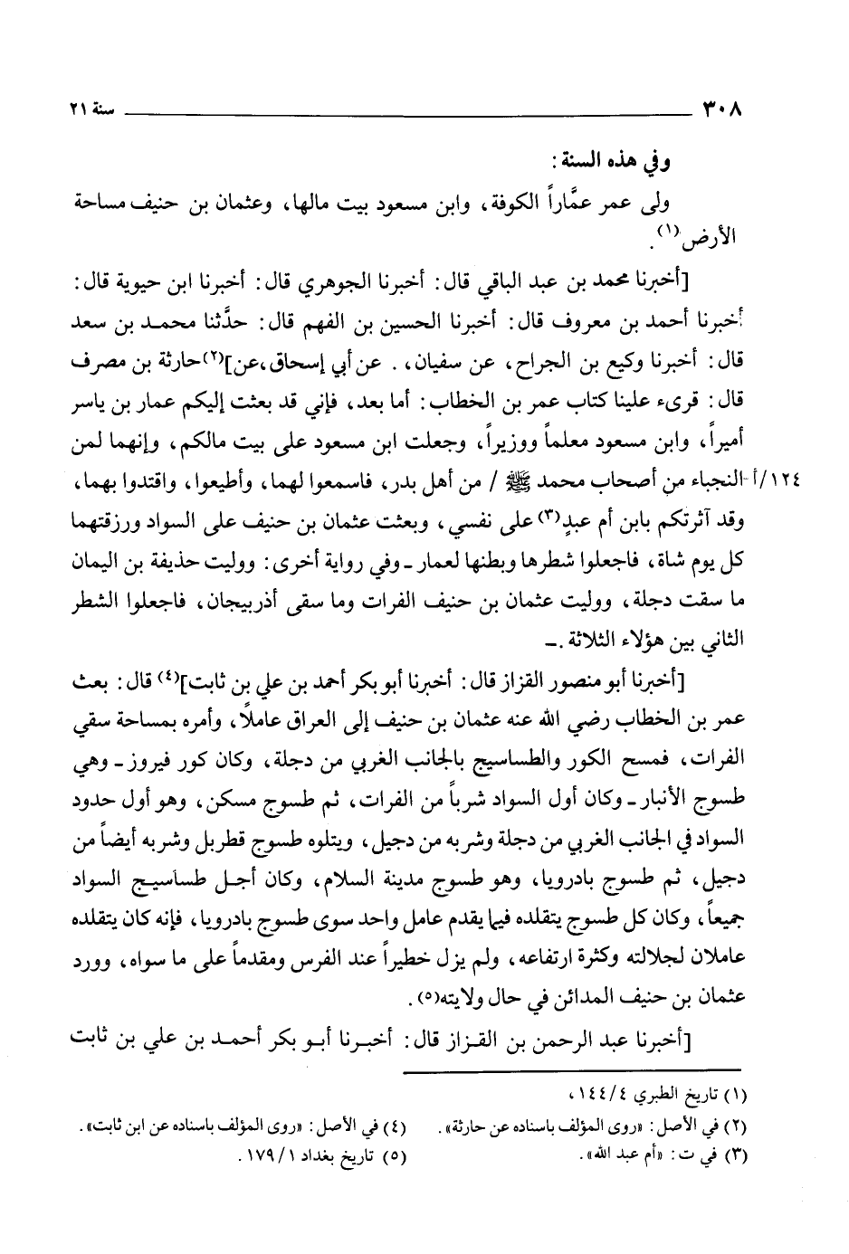 أخبرنا أحمد بن معروف قال: أخبرنا الحسين بن الفهم قال: حدثنا محمد بن سَعْدٍ قَالَ: أَخْبَرَنَا وَكِيعُ بْنُ الْجَرَّاحِ، عَنْ سُفْيَانَ، عَنْ أَبِي إِسْحَاقَ، عَنْ] [2] حَارِثَةَ بْنِ مُصَرِّفٍ قَالَ: قُرِئَ عَلَيْنَا كِتَابُ عُمَرَ بْنِ الْخَطَّابِ: أَمَّا بَعْدُ، فَإِنِّي قَدْ بَعَثْتُ إِلَيْكُمْ عَمَّارَ بْنَ يَاسِرٍ أَمِيرًا، وَابْنَ مَسْعُودٍ مُعَلِّمًا وَوَزِيرًا، وَجَعَلْتُ ابْنَ مَسْعُودٍ عَلَى بَيْتِ مَالِكُمْ، وَإِنَّهُمَا لَمِنَ النُّجَبَاءِ مِنْ أَصْحَابِ مُحَمَّدٍ صَلَّى الله عليه وآله وَسَلَّمَ/ مِنْ أَهْلِ بَدْرٍ، فَاسْمَعُوا لَهُمَا، وَأَطِيعُوا، وَاقْتَدُوا بِهِمَا، وَقَدْ آثَرْتُكُمْ بِابْنِ أُمِّ عَبْدٍ [3] عَلَى نَفْسِي، وَبَعَثْتُ عُثْمَانَ بْنَ حُنَيْفٍ عَلَى السَّوَادِ وَرَزَقْتُهُمَا كُلَّ يَوْمٍ شَاةً، فَاجْعَلُوا شِطْرَهَا وَبَطْنَهَا لِعَمَّارٍ- وَفِي رِوَايَةٍ أُخْرَى: وَوَلَّيْتُ حُذَيْفَةَ بْنَ الْيَمَانِ مَا سَقَتْ دِجْلَةُ، وَوَلَّيْتُ عُثْمَانَ بْنَ حَنِيفٍ الْفُرَاتَ وَمَا سَقَى أَذْرَبَيْجَانَ، فَاجْعَلُوا الشِّطْرَ الثَّانِي بَيْنَ هُؤَلاءِ الثَّلاثَةِ. -[أَخْبَرَنَا أَبُو منصور القزاز قال: أخبرنا أبو بَكْرٍ أَحْمَدُ بْنُ عَلِيِّ بْنِ ثَابِتٍ] [4] قَالَ: بَعَثَ عُمَرُ بْنُ الْخَطَّابِ رَضِيَ اللَّهُ عَنْهُ عُثْمَانَ بْنَ حُنَيْفٍ إِلَى الْعِرَاقِ عَامِلا، وَأَمَرَهُ بِمِسَاحَةِ سَقْيِ الفرات، فمسح الكور وَالطَّسَاسِيجَ بِالْجَانِبِ الْغَرْبِيِّ مِنْ دِجْلَةَ، وَكَانَ كَوْرَ فيروز- وهي طسوج الأنبار- وكان أول السواد شُرْبًا مِنَ الْفُرَاتِ، ثُمَّ طَسُوجُ مَسْكَنٍ، وَهُوَ أَوَّلُ حُدُودِ السَّوَادِ فِي الْجَانِبِ الْغَرْبِيِّ مِنْ دجلة وشربه مِنْ دُجَيْلٍ، وَيَتْلُوهُ طَسُوجُ قطربُّل وَشَرِبَهُ أَيْضًا مِنْ دُجَيْلٍ، ثُمَّ طَسُوجُ بَادروَيَا، وَهُوَ طَسُوجُ مَدِينَةِ السَّلامِ، وَكَانَ أَجَلَّ طَسَاسِيجِ السَّوَادِ جَمِيعًا، وَكَانَ كُلُّ طَسُوجٍ يَتَقَلَّدَهُ فِيمَا يَقْدَمُ عَامِلٌ واحد سِوَى طَسُوجِ بَادروَيَا، فَإِنَّهُ كَانَ يَتَقَلَّدَهُ عَامِلانِ لِجَلالَتِهِ وَكَثْرَةِ ارْتِفَاعِهِ، وَلَمْ يَزَلْ خَطِيرًا عِنْدَ الْفُرْسِ وَمُقَدَّما عَلَى مَا سِوَاهُ، وَوَرَدَ عُثْمَانُ بْنُ حُنَيْفٍ الْمَدَائِنَ فِي حَالِ وِلايَتِهِ [5] .