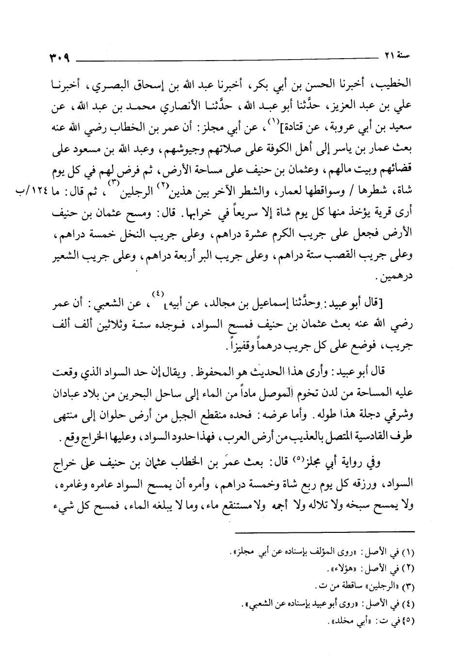 الْخَطِيبُ، أَخْبَرَنَا الْحَسَنُ بْنُ أَبِي بَكْرٍ، أَخْبَرَنَا عَبْدُ اللَّهِ بْنُ إِسْحَاقَ الْبَصْرِيُّ، أَخْبَرَنَا عَلِيُّ بْنُ عَبْدِ الْعَزِيزِ، حَدَّثَنَا أَبُو عَبْدِ اللَّهِ، حَدَّثَنَا الأَنْصَارِيُّ مُحَمَّدُ بْنُ عَبْدِ اللَّهِ، عَنْ سَعِيدُ بْنُ أَبِي عَرُوبَةَ، عَنْ قَتَادَةَ] [1] ، عَنْ أَبِي مِجْلَزٍ: أَنَّ عُمَرَ بْنَ الْخَطَّابِ رَضِيَ اللَّهُ عَنْهُ بَعَثَ عَمَّارَ بْنَ يَاسِرٍ إِلَى أَهْلِ الْكُوفَةِ عَلَى صَلاتِهِمْ وَجُيُوشِهِمْ، وَعَبْدَ اللَّهِ بْنَ مَسْعُودٍ عَلَى قَضَائِهِمْ وَبَيْتِ مَالِهِمْ، وَعُثْمَانَ بْنَ حَنِيفٍ عَلَى مِسَاحَةِ الأَرْضِ، ثُمَّ فَرَضَ لَهُمْ فِي كُلِّ يَوْمٍ شَاةً، شِطْرُهَا/ وَسَوَاقِطُهَا لِعَمَّارٍ، وَالشِّطْرُ الآخَرُ بَيْنَ هَذَيْنِ [2] الرَّجُلَيْنِ [3] ، ثُمَّ قَالَ: مَا أَرَى قَرْيَةً يُؤْخَذُ مِنْهَا كُلَّ يَوْمٍ شَاةٌ إِلا سَرِيعًا فِي خَرَابِهَا. قَالَ: وَمَسَحَ عُثْمَانُ بْنُ حُنَيْفٍ الأَرْضَ فَجَعَلَ عَلَى جَرِيبِ الْكَرْمِ عَشْرَةَ دَرَاهِمَ، وَعَلَى جَرِيبِ النَّخْلِ خَمْسَةَ دَرَاهِمَ، وَعَلَى جَرِيبِ الْقَصَبِ سِتَّةَ دَرَاهِمَ، وَعَلَى جَرِيبِ الْبُرِّ أَرْبَعَةَ دَرَاهِمَ، وَعَلَى جَرِيبِ الشَّعِيرِ دِرْهَمَيْنِ.