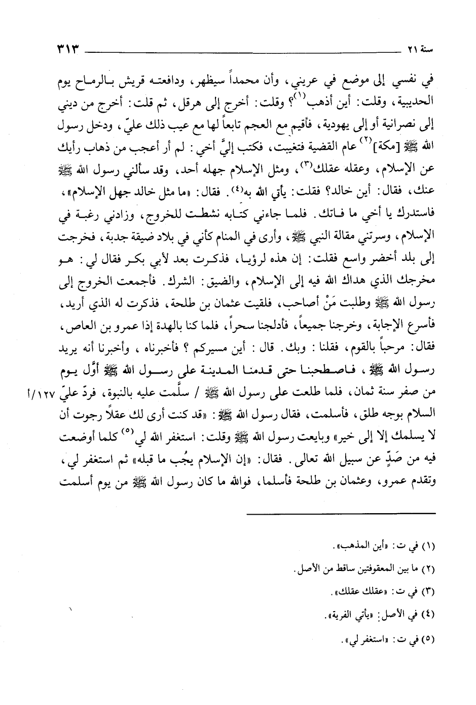 فِي نَفْسِي إِلَى مَوْضِعٍ فِي عَرِينِي، وَأَنَّ مُحَمَّدًا سَيَظْهَرُ، وَدَافَعَتْهُ قُرَيْشٌ بِالرِّمَاحِ يَوْمَ الْحُدَيْبِيَةِ، وَقُلْتُ: أَيْنَ أَذْهَبُ [1] ؟ وَقُلْتُ: أَخْرُجُ إِلَى هِرَقْلَ، ثُمَّ قُلْتُ: أَخْرُجُ مِنْ دِينِي إِلَى نَصْرَانِيَةٍ أَوْ إِلَى يَهُودِيَّةٍ، فَأُقِيمُ مَعَ الْعَجَمِ تَابِعًا لَهَا مَعَ عَيْبِ ذَلِكَ عَلَيَّ، وَدَخَلَ رَسُولُ الله صلّى الله عليه وآله وَسَلَّمَ [مَكَّةَ] [2] عَامَ الْقَضِيَّةِ فَتَغَيَّبْتُ، فَكَتَبَ إِلَيَّ أَخِي: لَمْ أَرَ أَعْجَبَ مِنْ ذَهَابِ رَأْيِكَ عَنِ الإِسْلامِ، وَعَقْلُهُ عَقْلُكَ [3] ، وَمِثْلُ الإِسْلامِ جَهِلَهُ أَحَدٌ، وَقَدْ سَأَلَنِي رَسُولُ اللَّهِ صَلَّى اللَّهُ عليه وآله وَسَلَّمَ عَنْكَ، فَقَالَ: أَيْنَ خَالِدٌ؟ فَقُلْتُ: يَأْتِي اللَّهُ بِهِ [4] . فَقَالَ: «مَا مِثْلُ خَالِدٍ جَهِلَ الإِسْلامَ» ، فَاسْتَدْرِكْ يَا أَخِي مَا فَاتَكَ. فَلَمَّا جَاءَنِي كِتَابُهُ نَشَطْتُ لِلْخُرُوجِ، وَزَادَنِي رَغْبَةً فِي الإِسْلامِ، وَسَرَّتْنِي مَقَالَةُ النَّبِيِّ صَلَّى اللَّهُ عَلَيْهِ وآله وَسَلَّمَ، وَأَرَى فِي الْمَنَامِ كَأَنِّي فِي بِلادٍ ضيقة جدبة، فخرجت إلى بلد أَخْضَرَ وَاسِعٍ فَقُلْتُ: إِنَّ هَذِهِ لَرُؤْيَا، فَذَكَرْتُ بَعْدُ لأَبِي بَكْرٍ فَقَالَ لِي: هُوَ مَخْرَجُكَ الَّذِي هَدَاكَ اللَّهُ فِيهِ إِلَى الإِسْلامِ، وَالضِّيقُ: الشِّرْكُ. فَأَجْمَعْتُ الْخُرُوجَ إِلَى رَسُولِ اللَّهِ صَلَّى الله عليه وآله وَسَلَّمَ وَطَلَبْتُ مِنْ أَصَاحِبَ، فَلَقِيتُ عُثْمَانَ بْنَ طَلْحَةَ، فَذَكَرْتُ لَهُ الَّذِي أُرِيدُ، فَأَسْرَعَ الإِجَابَةَ، وَخَرَجْنَا جَمِيعًا، فَأَدْلَجْنَا سَحَرًا، فَلَمَّا كُنَّا بِالْهَدَّةِ إِذَا عَمْرُو بْنُ الْعَاصِ، فَقَالَ: مَرْحَبًا بِالْقَوْمِ، فَقُلْنَا: وَبِكَ. قَالَ: أَيْنَ مَسِيرُكُمْ؟ فَأَخْبَرْنَاهُ، وَأَخْبَرَنَا أَنَّهُ يُرِيدُ رَسُولَ اللَّهِ صَلَّى اللَّهُ عَلَيْهِ وآله وَسَلَّمَ، فَاصْطَحَبَنَا حَتَّى قَدِمْنَا الْمَدِينَةَ عَلَى رَسُولِ الله صلّى الله عليه وآله وَسَلَّمَ أَوَّلَ يَوْمٍ مِنْ صَفَرَ سَنَة ثَمَانٍ، فَلَمَّا طَلَعْتُ عَلَى رَسُولِ اللَّهِ صَلَّى اللَّهُ عليه وآله وسلم سلّمت عليه بالنّبوّة، فردّ عليّ السلام بِوَجْهٍ طَلْقٍ، فَأَسْلَمْتُ، فَقَالَ رَسُولُ اللَّهِ صَلَّى الله عليه وآله وَسَلَّمَ: «قَدْ كُنْتُ أَرَى لَكَ عَقْلا رَجَوْتُ أَنْ لا يُسْلِمَكَ إِلا إِلَى خَيْرٍ» وَبَايَعْتُ رسول الله صَلى اللهُ عَلَيه وآله وَسَلَّمَ وقلت: استغفر الله لي [5] كلما أُوضِعْتُ فِيهِ مِنْ صَدٍّ عَنْ سَبِيلِ اللَّهِ تَعَالَى. فَقَالَ: «إِنَّ الإِسْلامَ يَجُبُّ مَا قَبْلَهُ» ثُمَّ اسْتَغْفِرْ لِي، وَتَقَدَّمَ عَمْرٌو، وَعُثْمَانُ بْنُ طلحة فأسلما، فو الله مَا كَانَ رَسُولُ اللَّهِ صَلَّى اللَّهُ عَلَيْهِ وآله وسلم من يوم أسلمت