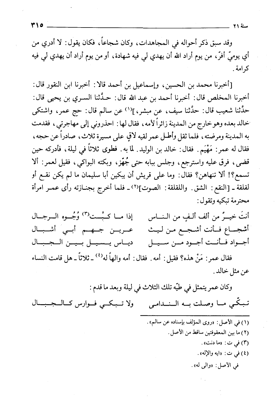 حدثنا شعيب قال: حَدَّثَنَا سَيْفٌ، عَنْ مُبَشِّرٍ،] [1] عَنْ سَالِمٍ قَالَ: حَجَّ عُمَرُ، وَاشْتَكَى خَالِدٌ بَعْدَهُ وَهُوَ خَارِجٌ من المدينة زائرا الأمة، فَقَالَ لَهَا: احْذَرُونِي إِلَى مُهَاجَرَتِي، فَقَدِمَتْ بِهِ الْمَدِينَةَ وَمَرَّضَتْهُ، فَلَمَّا ثَقُلَ وَأَطَلَّ عُمَرُ لَقِيَهُ لاقٍ عَلَى مَسِيرَةِ ثَلاثٍ، صَادِرًا عَنْ حَجِّهِ، فَقَالَ لَهُ عُمَرُ: مَهْيَمْ. فَقَالَ: خَالِدُ بْنُ الْوَلِيدِ. لِمَا بِهِ. فَطَوَى ثَلاثًا فِي لَيْلَةٍ، فَأَدْرَكَهُ حِينَ قَضَى، فَرَقَّ عَلَيْهِ وَاسْتَرْجَعَ، وَجَلَسَ بِبَابِهِ حَتَّى جُهِّزَ، وَبَكَتْهُ الْبَوَاكِي، فَقِيلَ لِعُمَرَ: أَلا تَسْمَعُ؟! أَلا تَنْهَاهُنَّ؟ فَقَالَ: وَمَا عَلَى قُرَيْشٍ أَنْ يَبْكِينَ أَبَا سُلَيْمَانَ مَا لَمْ يَكُنْ نَقْعٌ أَوْ لَقْلَقَةٌ- النَّقْعُ: الشَّقُّ. وَاللَّقْلَقَةُ: الصَّوْتُ] [2]- فَلَمَّا أُخْرِجَ بِجِنَازَتِهِ رَأَى عُمَرُ امْرَأَةً مُحْتَرِمَةً تَبْكِيهِ وَتَقُولُ: