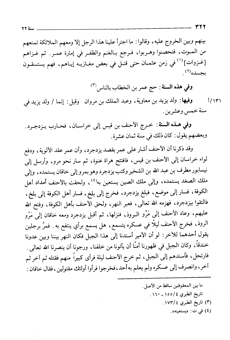 وَقَدْ ذَكَرْنَا أَن الأحنف أشار عَلَى عُمَر بقصد يزدجرد، وأن عُمَر عقد الألوية، ودفع لواء خراسان إِلَى الأحنف بْن قيس، فافتتح هراة عنوة، ثُمَّ سار نَحْو مرو، وأرسل إِلَى نيسابور مطرف بْن عَبْد اللَّهِ بْن الشخير وكتب يزدجرد وَهُوَ بمرو إِلَى خاقان يستمده، وإلى ملك الصغد يستمده، وإلى ملك الصين يستعين بِهِ [4] ، ولحقت بالأحنف أمداد أَهْل الكوفة، فسار إِلَى موضع، فبلغ يزدجرد، فخرج إِلَى بلخ، فسار أَهْل الكوفة إِلَى بلخ، فالتقوا بيزدجرد، فهزمه اللَّه تَعَالَى، فعبر النهر، ولحق الأحنف بأهل الكوفة، وفتح الله عليهم، وعاد الأحنف إلى مروالروذ، فنزلها، ثُمَّ أقبل يزدجرد ومعه خاقان إِلَى مروالروذ، فخرج الأحنف ليلا فِي عسكره يتسمع، هل يسمع برأي ينتفع بِهِ. فمر برجلين يَقُول أحدهما للآخر: لو أَن الأمير أسندنا إِلى هَذَا الجبل فكان النهر بيننا وبين عدونا خندقا، وَكَانَ الجبل فِي ظهورنا أمنا أَن يأتونا من خلفنا، ورجونا أَن ينصرنا اللَّه تَعَالَى.
