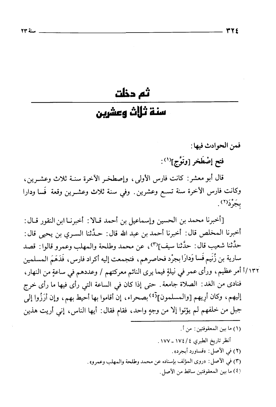 قَالَ أَبُو معشر: كانت فارس الأولى، وإصطخر الآخرة سَنَة ثَلاث وعشرين، وكانت فارس الآخرة سَنَة تسع وعشرين. وفي سنة ثلاث وعشرين وقعة فسا ودارابجرد [2] .