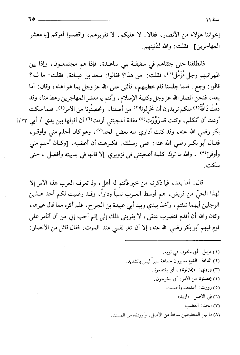 قَالُوا: وَجِعٌ. فَلَمَّا جَلَسْنَا قَامَ خَطِيبُهُمْ، فَأَثْنَى عَلَى اللَّهِ عَزَّ وَجَلَّ بِمَا هُوَ أَهْلُهُ، وَقَالَ: أَمَّا بَعْدُ، فَنَحْنُ أَنْصَارُ اللَّهِ عَزَّ وَجَلَّ وَكَتِيبَةُ الإِسْلامِ، وَأَنْتُمْ يَا مَعْشَرَ الْمُهَاجِرِينَ رَهْطٌ مِنَّا، وَقَدْ دَفَّتْ دَافَّةٌ [2] مِنْكُمْ تُرِيدُونَ أَنْ تَخْزِلُونَا [3] مِنْ أَصْلِنَا، وَتَحْصُنُونَا مِنَ الأَمْرِ [4] . فَلَمَّا سَكَتَ أَرَدْتُ أَنْ أَتَكَلَّمَ، وَكُنْتُ قَدْ زَوَّرْتُ [5] مَقَالَةً أَعْجَبَتْنِي أَرَدْتُ [6] أَنْ أَقُولَهَا بَيْنَ يَدَيْ/ أَبِي بَكْرٍ رَضِيَ اللَّهُ عَنْهُ، وَقَدْ كُنْتُ أُدَارِي مِنْهُ بَعْضَ الْحَدِّ [7] ، وَهُوَ كَانَ أَحْلَمُ مِنِّي وَأَوْقَرُ، فَقَالَ أَبُو بَكْرٍ رَضِيَ اللَّهُ عَنْهُ: عَلَى رِسْلِكَ. فَكَرِهْتُ أَنْ أُغْضِبَهُ، [وَكَانَ أَحْلَمَ مِنِّي وَأَوْقَرَ] [8] ، وَاللَّهِ مَا تَرَكَ كَلِمَةً أَعْجَبَتْنِي فِي تَزْوِيرِي إِلا قَالَهَا فِي بَدِيهَتِهِ وَأَفْضَلَ، حَتَّى سَكَتَ.
