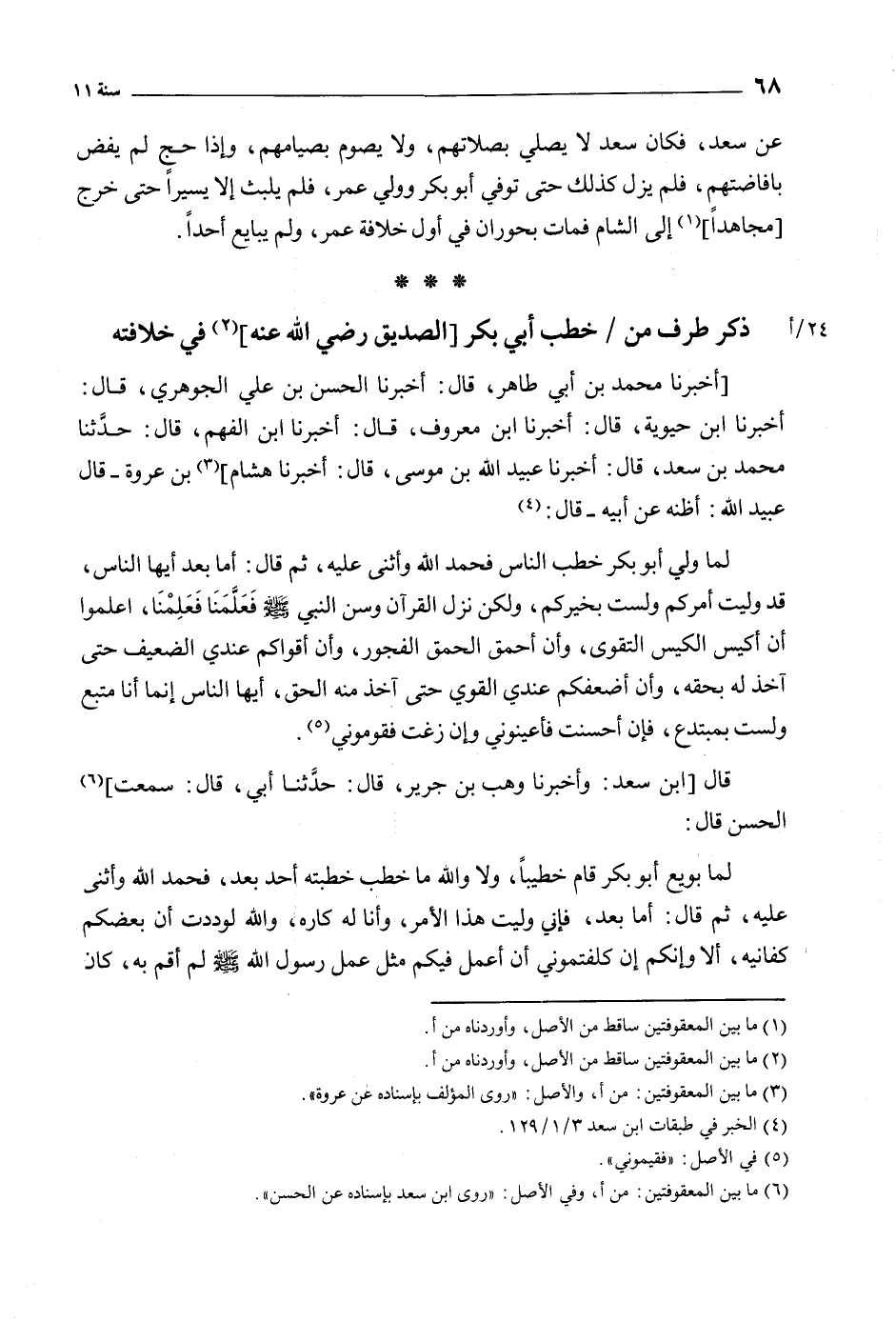 أخبرنا ابن حيوية، قَالَ: أَخْبَرَنَا ابْنُ مَعْرُوفٍ، قَالَ: أَخْبَرَنَا ابْنُ الفهم، قَالَ: حدثنا محمد بن سعد، قال: أَخْبَرَنَا عُبَيْدُ اللَّهِ بْنُ مُوسَى، قَالَ: أَخْبَرَنَا هِشَامُ] [3] بْنُ عُرْوَةَ- قَالَ عُبَيْدُ اللَّهِ: أَظُنُّهُ عَنْ أَبِيهِ- قَالَ: [4] لَمَّا وَلِيَ أَبُو بَكْرٍ خَطَبَ النَّاسَ فَحَمِدَ اللَّهَ وَأَثْنَى عَلَيْهِ، ثُمَّ قَالَ: أَمَّا بَعْدُ أَيُّهَا النَّاسُ، قَدْ وُلِّيتُ أَمْرَكُمْ وَلَسْتُ بِخَيْرِكُمْ، وَلَكِنْ نَزَلَ الْقُرْآنُ وَسَنَّ النبي صلّى الله عليه وآله وسلم فَعَلَّمَنَا فَعَلِمْنَا، اعْلَمُوا أَنَّ أَكْيَسَ الْكَيْسِ التَّقْوَى، وَأَنَّ أَحْمَقَ الْحُمْقِ الْفُجُورُ، وَأَنَّ أَقْوَاكُمْ عِنْدِي الضعيف حتى آخذ له بِحَقِّهِ، وَأَنَّ أَضْعَفَكُمْ عِنْدِي الْقَوِيَّ حَتَّى آخُذَ مِنْهُ الْحَقَّ، أَيُّهَا النَّاسُ إِنَّمَا أَنَا مُتَّبِعٌ وَلَسْتُ بِمُبْتَدِعٍ، فَإِنْ أَحْسَنْتُ فَأَعِينُونِي وَإِنْ زُغْتُ فَقَوِّمُونِي [5] .