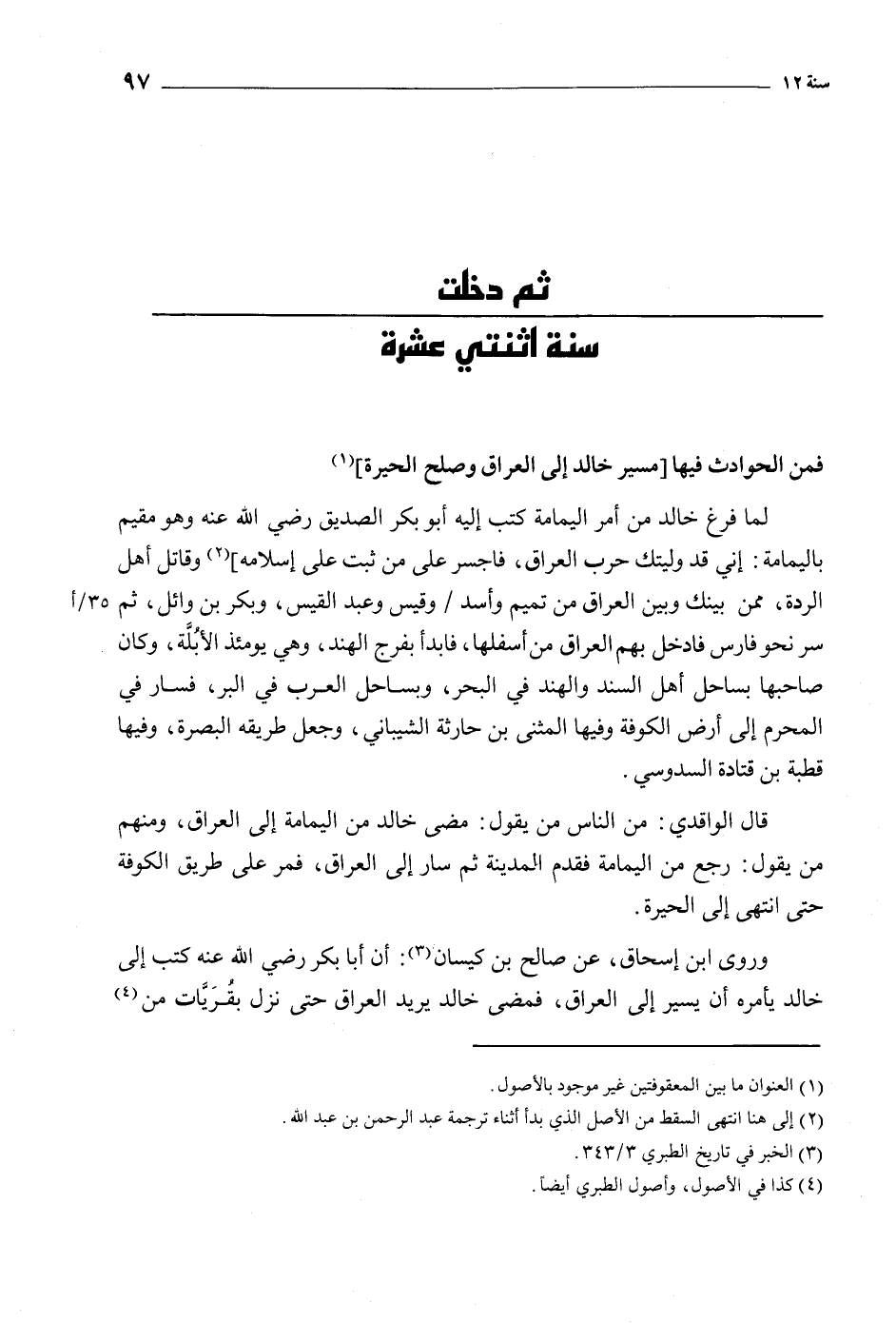 وروى ابن إسحاق، عن صالح بن كيسان [3] : أن أبا بكر رضي الله عنه كتب إلى خالد يأمره أن يسير إلى العراق، فمضى خالد يريد العراق حتى نزل بقريّات من [4]