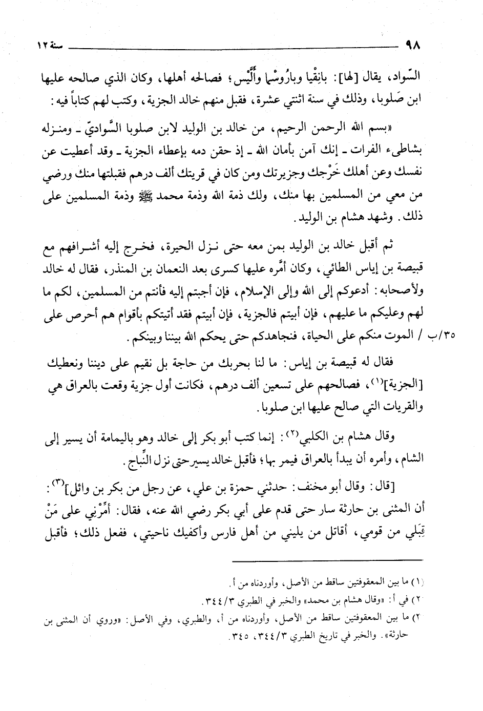 السواد، يقال [لها] : بانقيا وباروسما وأليس، فصالحه أهلها، وكان الذي صالحه عليها ابن صلوبا، وذلك في سنة اثنتي عشرة، فقبل منهم خالد الجزية، وكتب لهم كتابا فيه:
