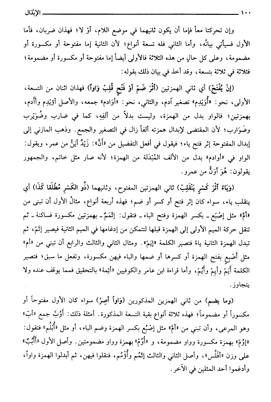 "وياء أثر كسر ينقلب" ثاني الهمزتين المفتوح، وثانيهما "ذو الكسر مطلقا كذا" أي ينقلب ياء، سواء كان إثر فتح أو كسر أو ضم؛ فهذه أربعة أنواع، مثال الأول أن تبنى من "أم" مثل إصبع –بكسر الهمزة وفتح الباء- فتقول: إئمم –بهمزتين مكسورة فساكنة- ثم تنقل حركة الميم الأولى إلى الهمزة قبلها لتتمكن من إدغامها في الميم الثانية فيصير إثم، ثم تبدل الهمزة الثانية ياء فتصير الكلمة "إيم". ومثال الثاني والثالث والرابع أن تبني من "أم" مثل أصبع بفتح الهمزة أو كسرها أو ضمها والباء فيهن مكسورة، وتفعل ما سبق؛ فتصير الكلمة أيم وأيم وأيم، وأما قراءة ابن عامر والكوفيين "أئمة" بالتحقيق فمما يوقف عنده ولا يتجاوز.
