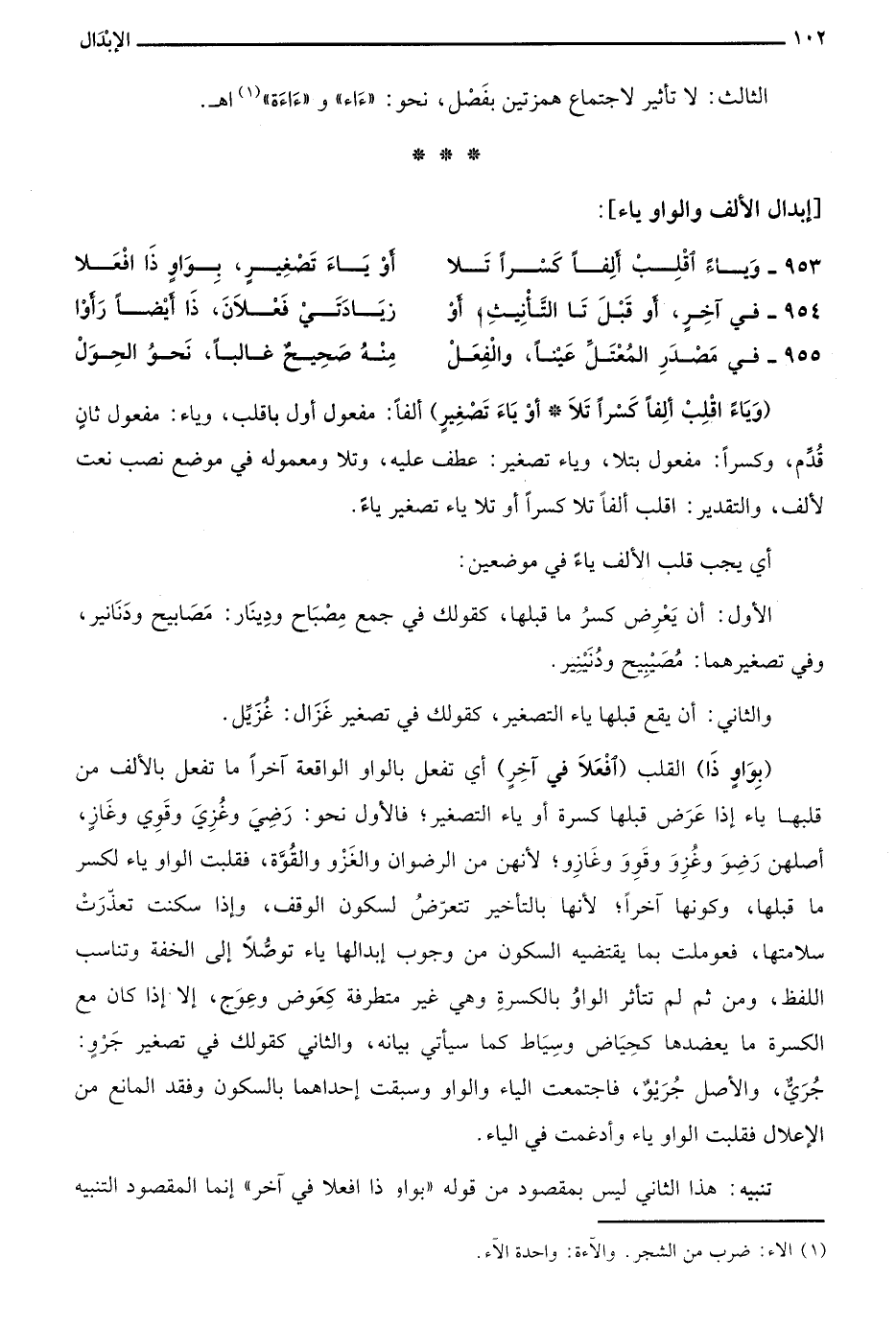 "وَيَاءً اقْلِبْ أَلفاً كَسْرًا تَلاَ أَوْ يَاءَ تَصْغِيْرٍ" ألفا: مفعول أول باقلب، وياء: مفعول ثان قدم، وكسرا: مفعول بتلا، وياء تصغير: عطف عليه، وتلا ومعموله في موض نصب نعت لألف، والتقدير: اقلب ألفا تلا كسرا أو تلا ياء تصغير ياء.