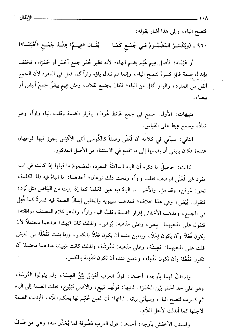 أو هيماء؛ فأصل هيم هيم بضم الهاء؛ لأنه نظير حمر جمع أحمر أو حمراء، فخفف بإبدال ضمة فائه كسرة لتصح الياء، وإنما لم تبدل ياؤه واوا كما فعل في المفرد لأن الجمع أثقل من المفرد، والواو أثقل من الياء؛ فكان يجتمع ثقلان، ومثل هيم بيض جمع أبيض أو بيضاء.