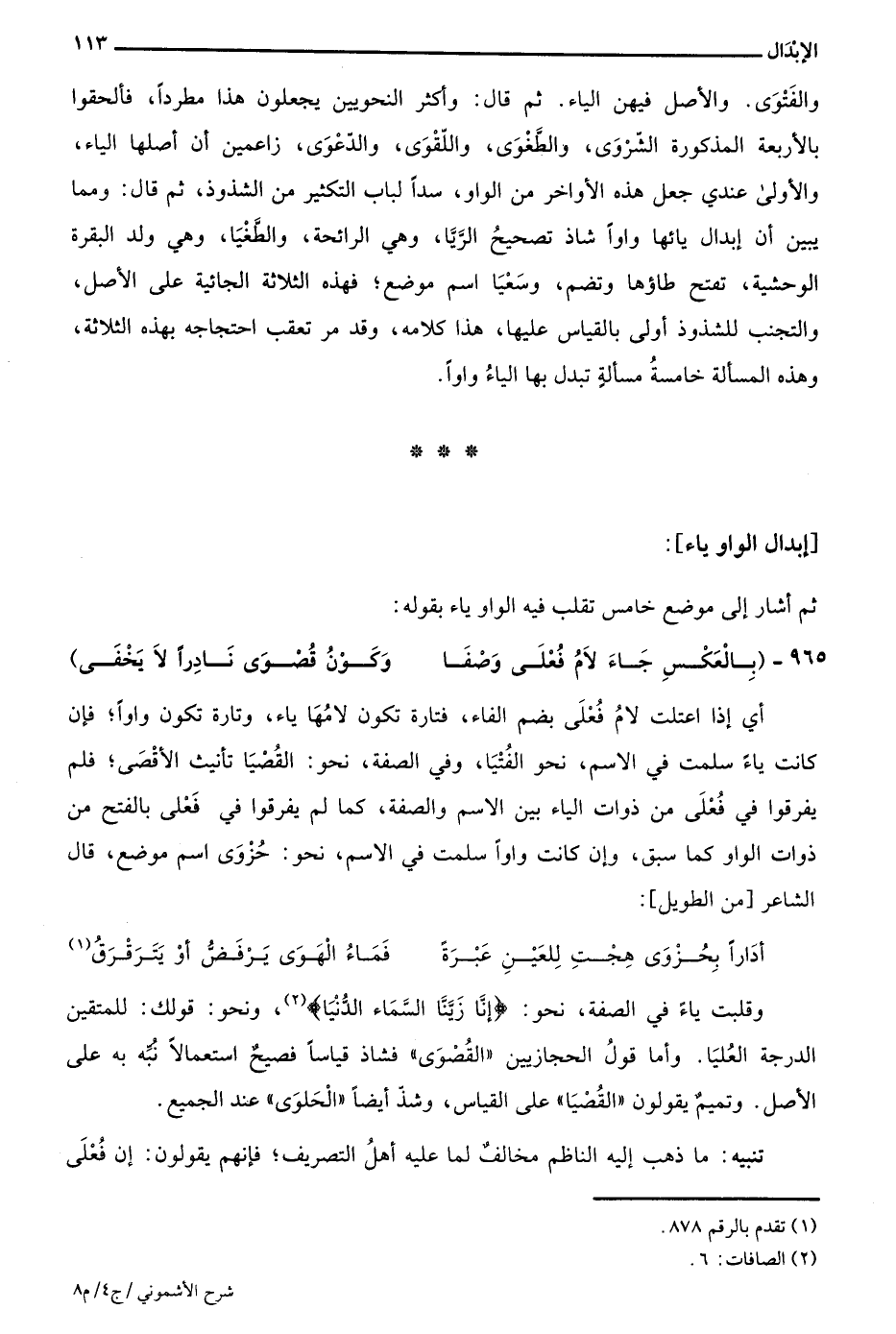 وقلبت ياء في الصفة، نحو: {إِنَّا زَيَّنَّا السَّمَاءَ الدُّنْيَا} 2، ونحو: قولك: للمتقين الدرجة العليا. وأما قول الحجازيين "القصوى" فشاذ قياسا فصيح استعمالا نبه به على الأصل. وتميم يقولون "القصيا" على القياس، وشذ أيضا "الحلوى عند الجميع.