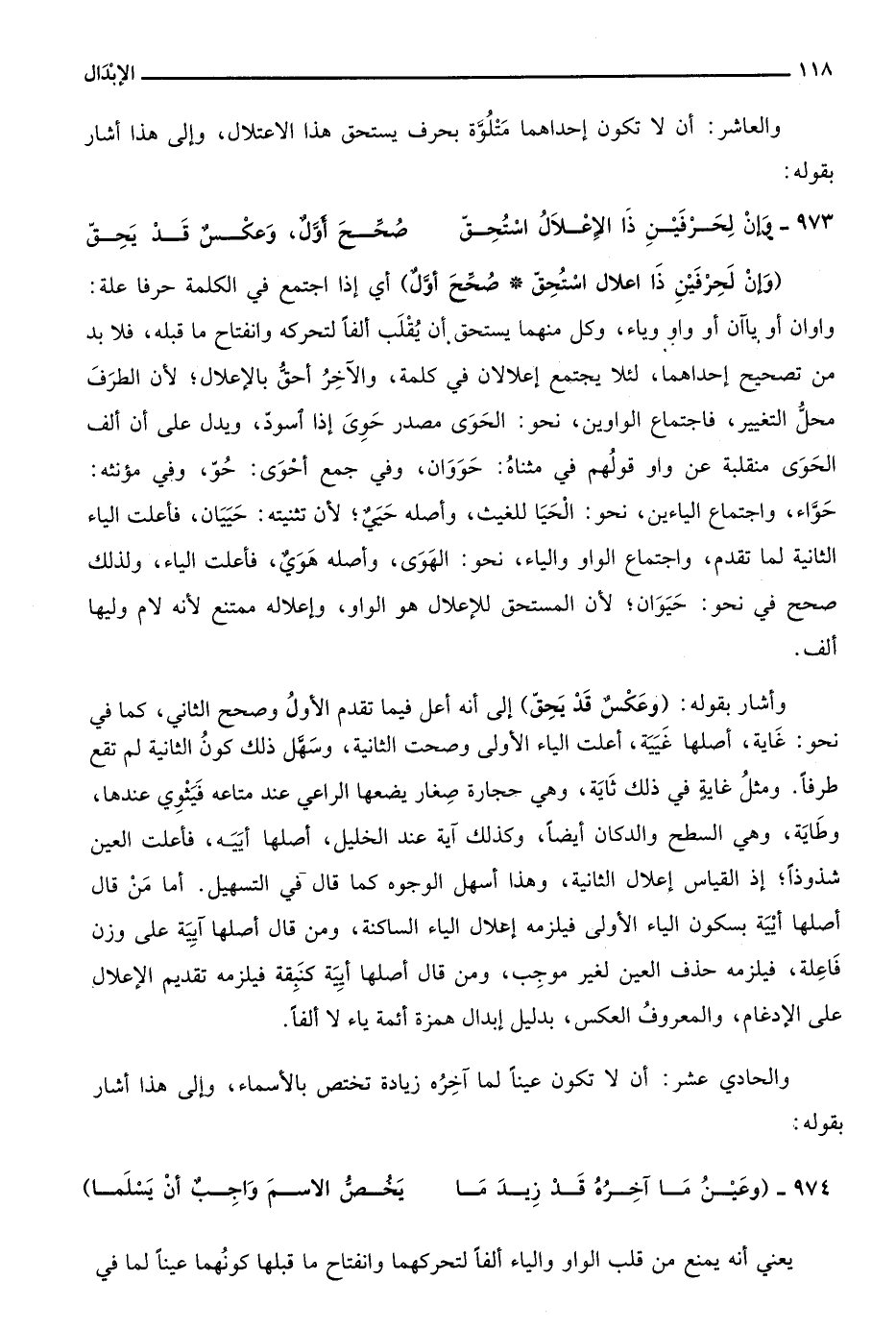 وإن لحرفين ذا اعلال استحق صحح أول" أي إذا اجتمع في الكلمة حرفا علة: واوان أو ياآن أو واو وياء، وكل منهما يستحق أن يقلب ألفا لتحركه وانفتاح ما قبله، فلا بد من تصحيح إحداهما، لئلا يجتمع إعلالان في كلمة، والآخر أحق بالإعلال؛ لأن الظرف محل التغيير، فاجتماع الواوين، نحو: الحوى مصدر حوى إذا اسود، ويدل على أن ألف الحوى منقلبة عن واو قولهم في مثناه: حووان، وفي جمع أحوى: حو، وفي مؤنثه: حواء، واجتماع الياءين، ونحو: الحيا للغيث، وأصله حيي، لأن تثنيته: حييان، فأعلت الياء الثانية لما تقدمِ، واجتماع الواو والياء، نحو: الهوى، وأصله هوي، فأعلت الياء، ولذلك صحح في نحو: حيوان؛ لأن المستحق للإعلال هو الواو، وإعلاله ممتنع لأنه لام وليها ألف.