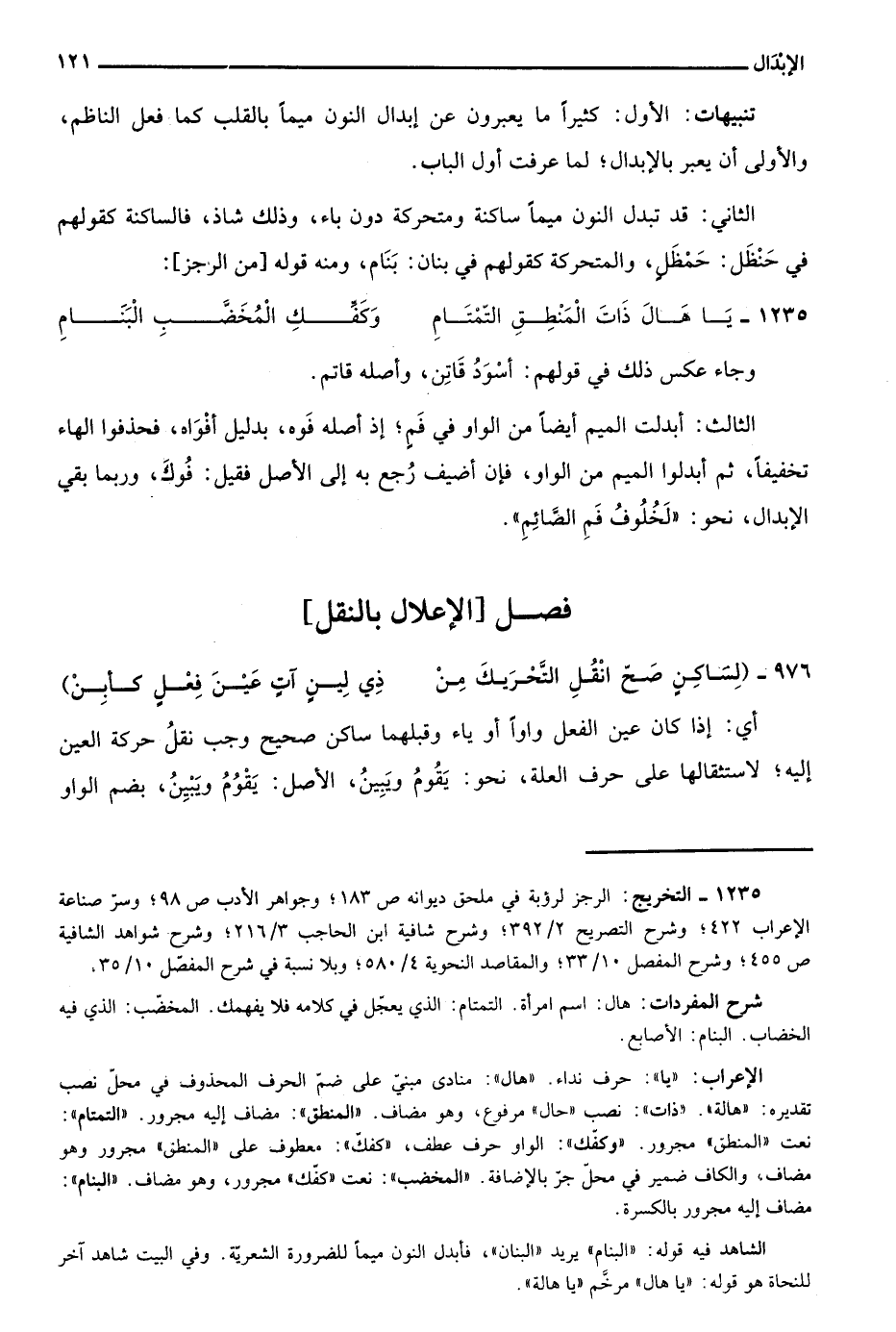 الثاني: قد تبدل النون ميما ساكنة ومتحركة دون باء، وذلك شاذ، فالساكنة كقولهم في حنظل: حمظل، والمتحركة كقولهم في بنان: بنام، ومنه قوله [من الرجز] :