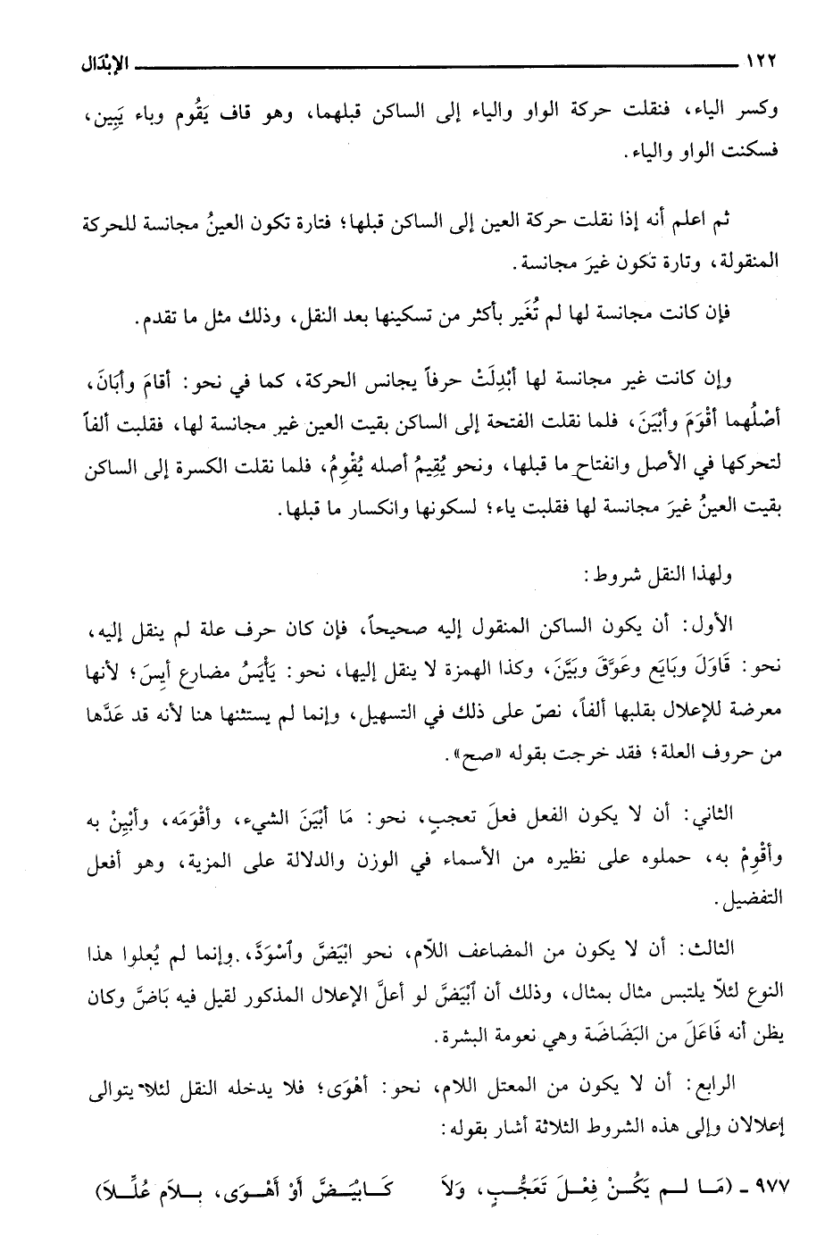 الرابع: أن يكون من المعتل اللام، نحو: أهوى؛ فلا يدخله النقل لئلا يتوالى إعلالان وإلى هذه الشروط الثلاثة أشار بقوله: