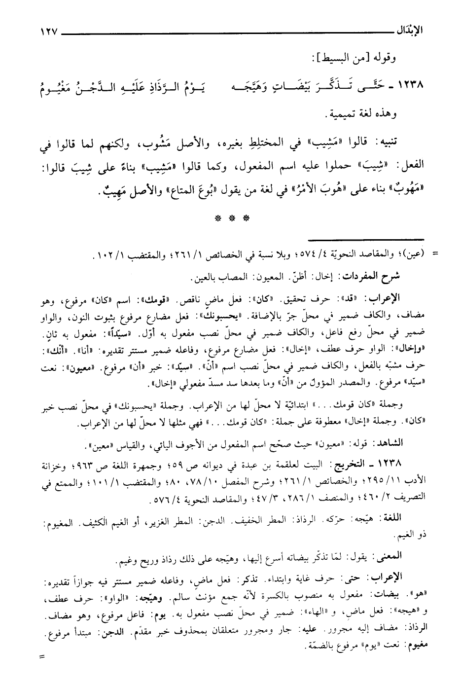 1238- التخريج: البيت لعلقمة بن عبدة في ديوانه ص59؛ وجمهرة اللغة ص963؛ وخزانة الأدب 11/ 295؛ والخصائص 1/ 261؛ وشرح المفصل 10/ 78، 80؛ والمقتضب 1/ 101؛ والممتع في التصريف 2/ 460؛ والمنصف 1/ 286، 3/ 47؛ والمقاصد النحوية 4/ 576.