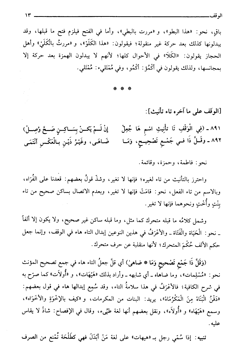 فِي الوَقْفِ تَا تَأْنِيْثِ الاسْمِ هَا جُعِلْ ... إنْ لَمْ يَكُنْ بِسَاكِنٍ صَحَّ وُصِلْ