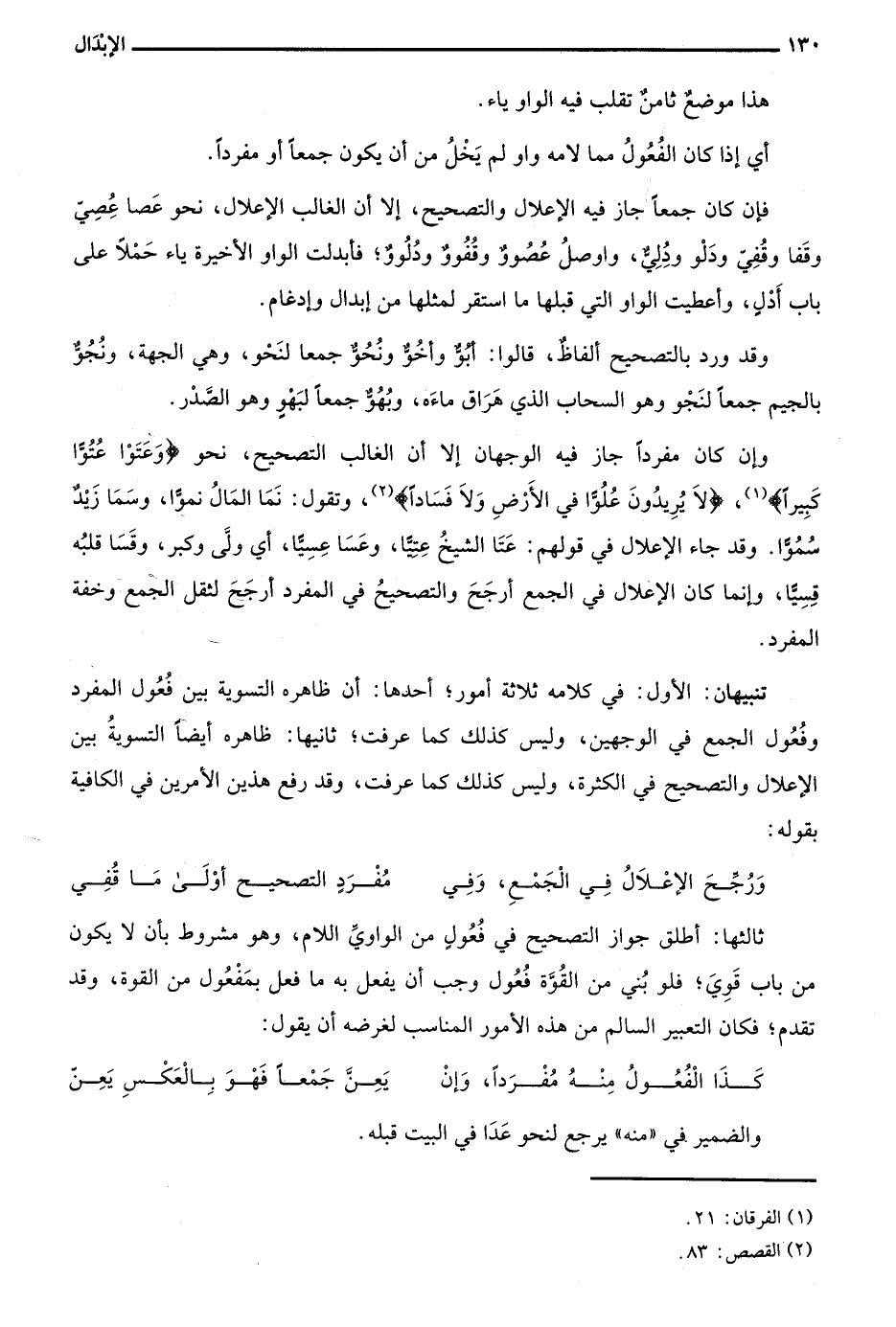 تنبيهان: الأول: في كلامه ثلاثة أمور؛ أحدها: أن ظاهرة التسوية بين فعول المفرد وفعول الجمع في الوجهين، وليس كذلك كما عرفت؛ ثانيها: ظاهرة أيضا التسوية بين الإعلال والتصحيح في الكثرة، وليس كذلك كما عرفت، وقد رفع هذين الأمرين في الكافية بقوله: