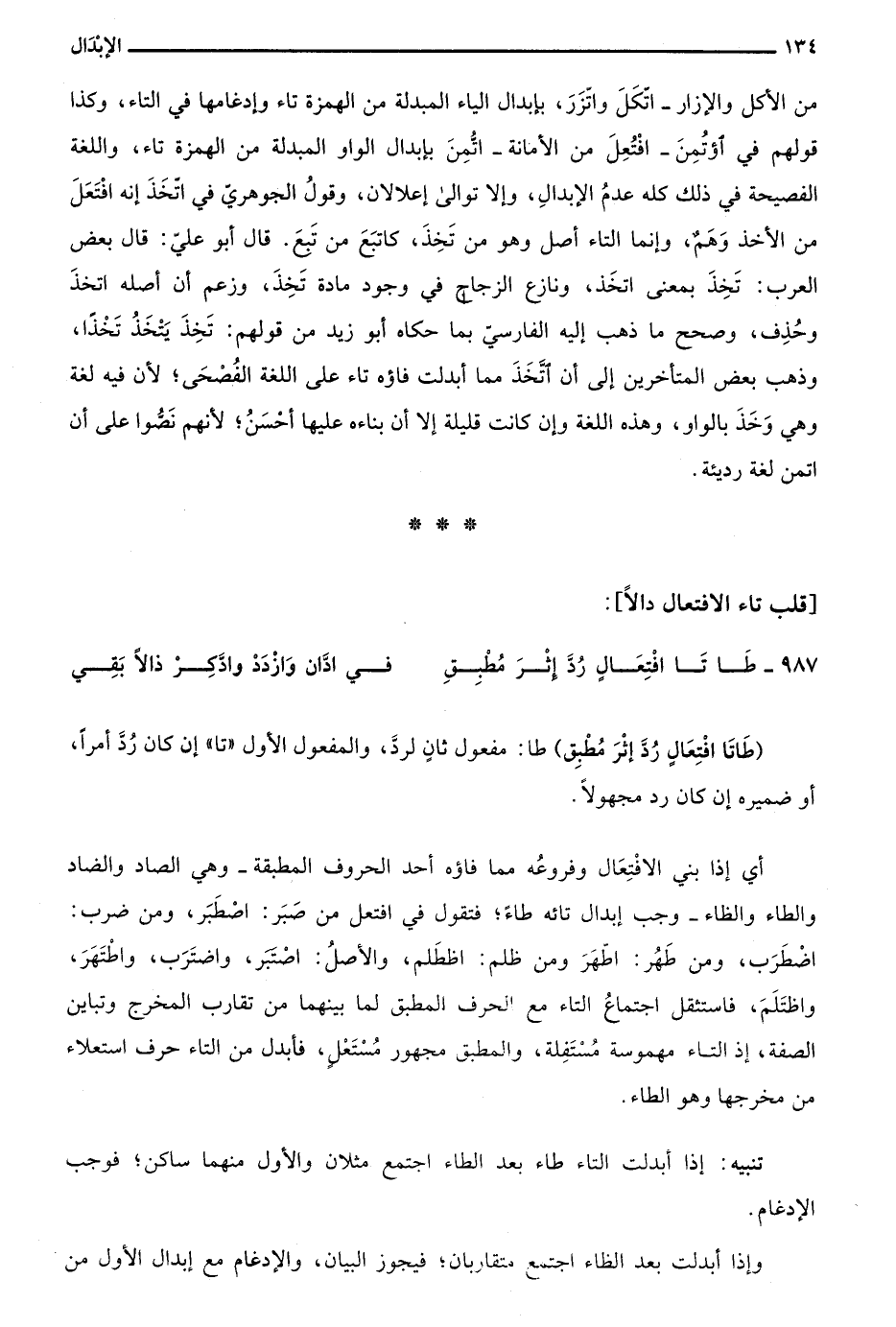 من الأكل والإزار –اتَّكَلَ واتَّزَرَ، بإبدال الياء المبدلة من الهمزة تاء وإدغامها في التاء، وكذا قولهم في اؤتمن – افتعل من الأمانة- اتمن بإبدال الواو المبدلة من الهمزة تاء، واللغة الفصيحة في ذلك كله عدم الإبدال، وإلا توالى إعلالان، وقول الجوهري في اتخذ إنه افتعل من الأخذ وهم، وإنما التاء أصل وهو من تخذ، كاتبع من تبع. قال أبو علي: قال بعض العرب: تخذ بمعنى اتخذ، ونازع الزجاج في وجود مادة تخذ، وزعم أن أصله اتخذ وحذف، وصحح ما ذهب إليه الفارسي بما حكاه أبو زيد من قولهم: تخذ يتخذ تخذا، وذهب بعض المتأخرين إلى أن اتخذ مما أبدلت فاؤه تاء على اللغة الفصحى؛ لأن فيه لغة وهي وخذ بالواو، وهذه اللغة وإن كانت قليلة إلا أن بناءه عليها أحسن؛ لأنهم نضوا على أن اتمن لغة رديئة.