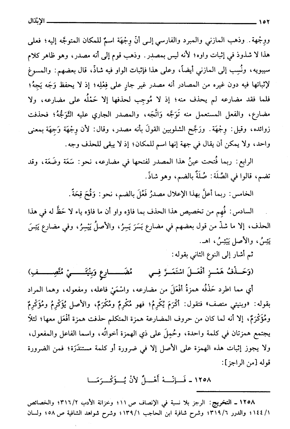 1258- التخريج: الرجز بلا نسبة في الإنصاف ص11؛ وخزانة الأدب 2/ 316؛ والخصائص 1/ 144؛ والدرر 6/ 319؛ وشرح شافية ابن الحاجب 1/ 139؛ وشرح شواهد الشافية ص58؛ ولسان
