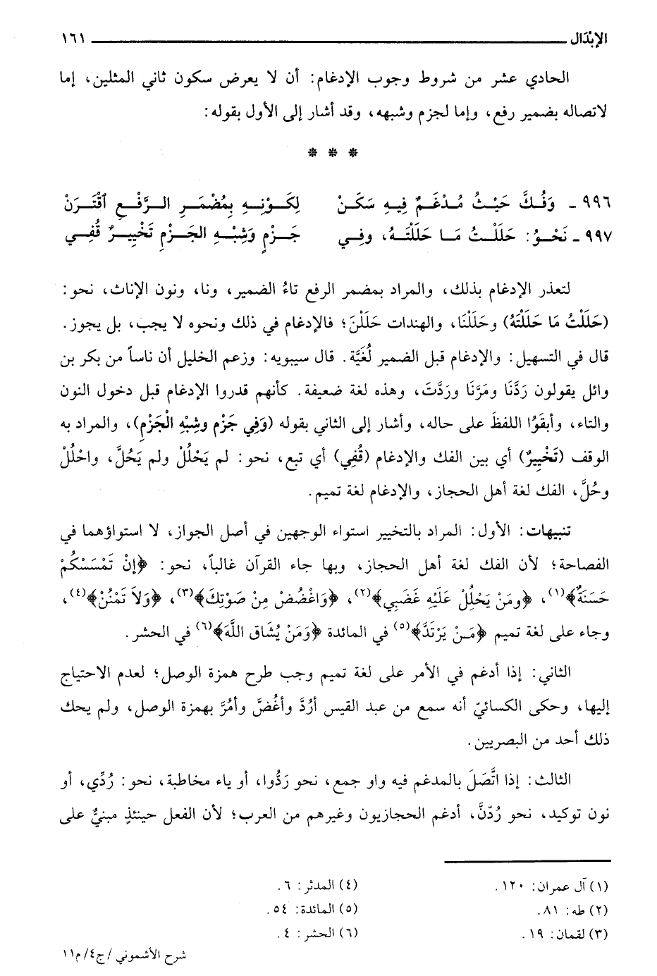 الحادي عشر من شروط وجوب الإدغام: أن لا يعرض سكون ثاني المثلين، أما لاتصاله بضمير رفع، وإما لجزم وشبهه، وقد أشار إلى الأول بقوله: