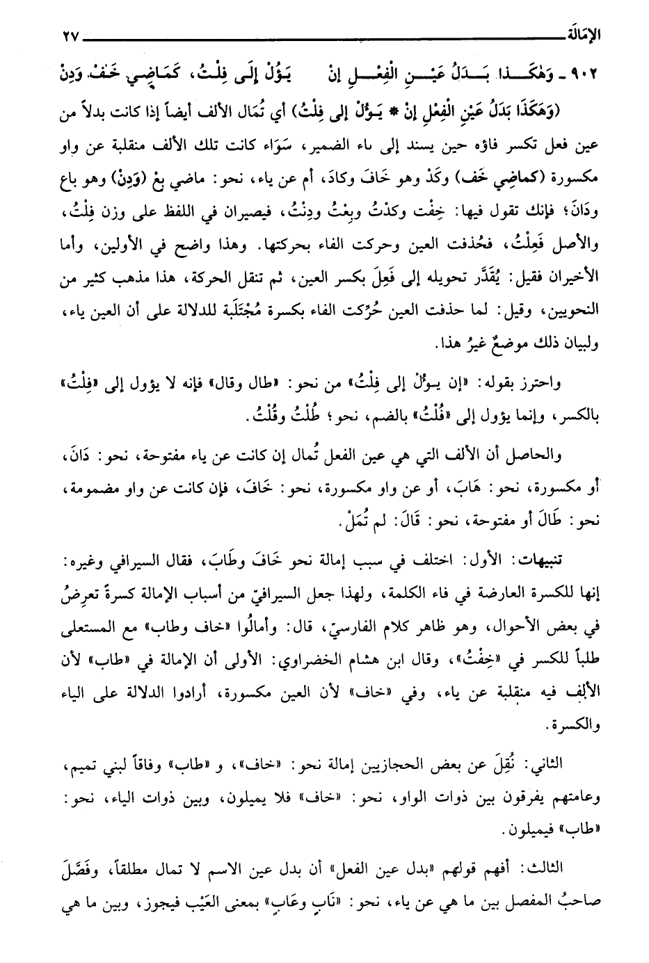 تنبيهات: الأول: اختلف في سبب إمالة نحو خاف وطاب، فقال السيرافي وغيره: إنها للكسرة العارضة في فاء الكلمة، ولهذا جعل السيرافي من أسباب الإمالة كسرة تعرض في بعض الأحوال، وهو ظاهر كلام الفارسي، قال: وأمالوا "خاف وطاب" مع المستعلي طلبا للكسر في "خفت"، وقال ابن هشام الخضراوي: الأولى أن الإمالة في "طاب" لأن الألف فيه منقلبة عن ياء، وفي "خاف" لأن العين مكسورة، أرادوا الدلالة على الياء والكسرة.