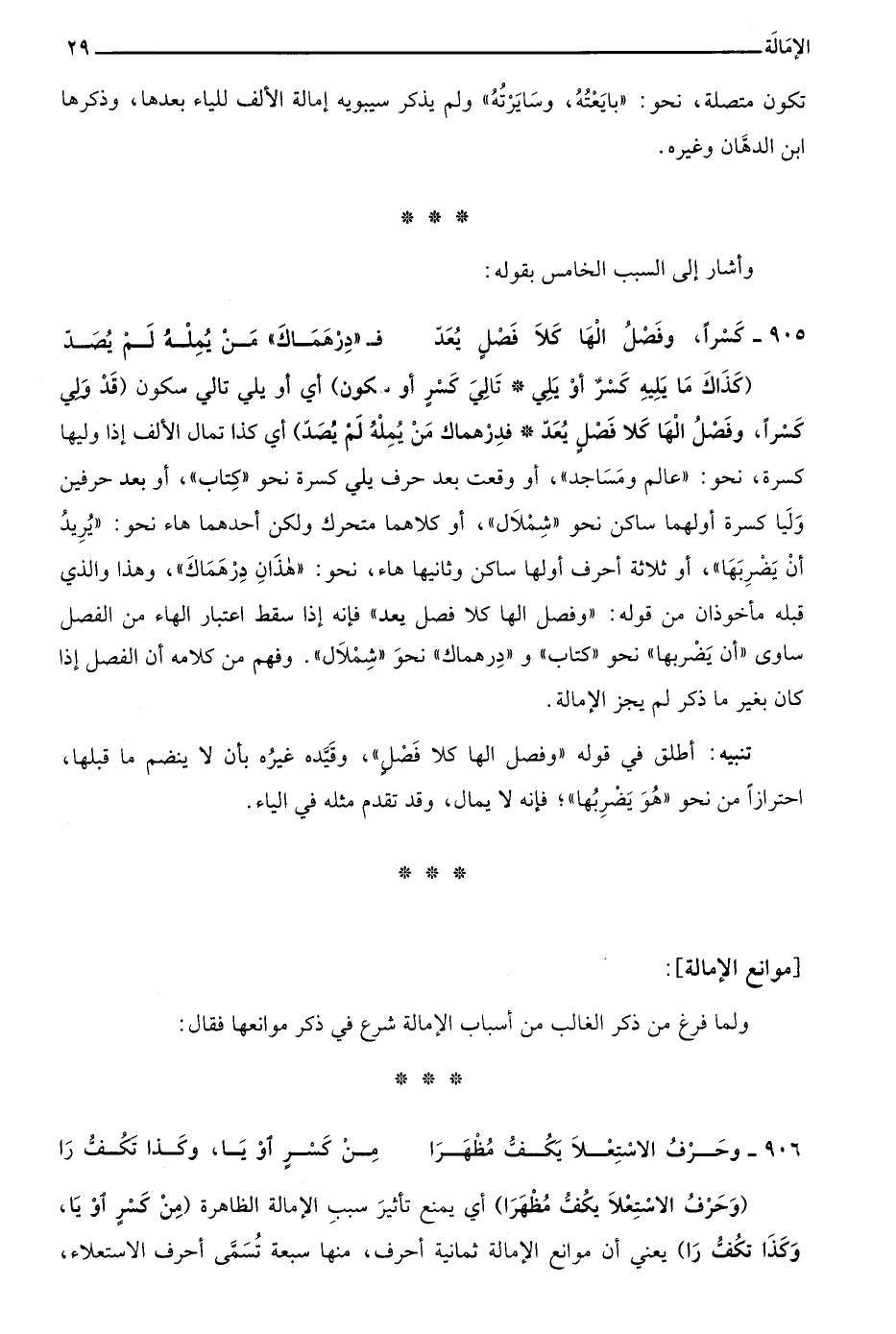 "كذاك ما يليه كسرا أو يلي تالي كسر أو سكون" أي أو يلي تالي سكون "قد ولي كسرا، وفضل الها كلا فصل يعد فدرهماك من يمله لم يصد" أي كذا تمال الألف إذا وليها كسرة، نحو: "عالم ومساجد"، أو وقعت بعد حرف يلي كسرة نحو "كتاب"، أو بعد حرفين وليا كسرة أولهما ساكن نحو "شملال"، أو كلاهما متحرك ولكن أحدهما هاء نحو: "يريد أن يضربها"، أو ثلاثة أحرف أولها ساكن وثانيها هاء، نحو: "هذان درهماك"، وهذا والذي قبله مأخوذان من قوله: "وفصل الها كلا فصل يعد" فإنه إذا سقط اعتبار الهاء من الفصل ساوى "أن يضربها" نحو "كتاب" و"درهماك" نحو "شملال". وفهم من كلامه أن الفصل إذا كان بغير ما ذكر لم يجز الإمالة.