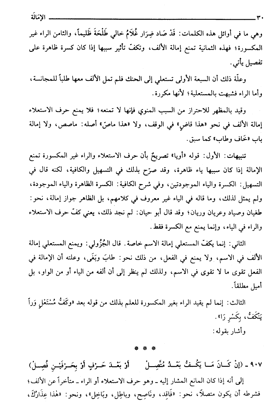 إلى أنه إذا كان المانع المشار إليه –وهو حرف الاستعلاء أو الراء- متأخرا عن الألف؛ فشرطه أن يكون متصلا، نحو: "فاقد، وناصح، وباطل، وباخل"، ونحو: "هذا عذارك،