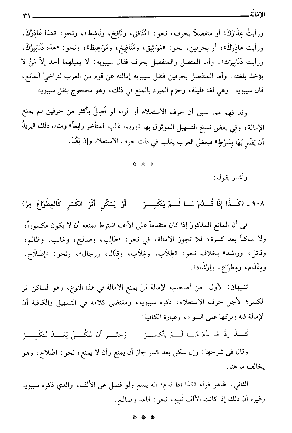 ورأيت عذارك" أو منفصلا بحرف، نحو: "منافق، ونافخ، وناشط"، ونحو: "هذا عاذرك، ورأيت عاذرك"، أو بحرفين، نحو: "مواثيق، ومنافيخ، ومواعيظ"، ونحو: "هذه دنانيرك، ورأيت دنانيرك". أما المتصل والمنفصل بحرف فقال سيبويه: لا يميلهما أحد إلا من لا يؤخذ بلغته. وأما المنفصل بحرفين فنقل سيبويه إمالته عن قوم من العرب لتراخي المانع، قال سيبويه: وهي لغة قليلة، وجزم المبرد بالمنع في ذلك، وهو محجوج بنقل سيبويه.