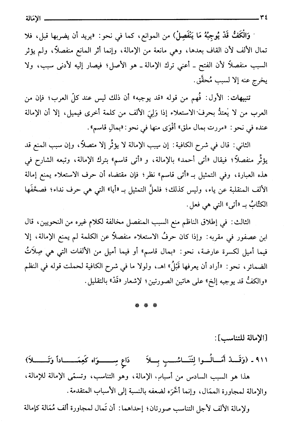 الثاني: قال في شرح الكافية: إن سبب الإمالة لا يؤثر إلا متصلا، وإن سبب المنع قد يؤثر منفصلا؛ فيقال "أتى أحمد" بالإمالة، و"أتى قاسم" بترك الإمالة، وتبعه الشارح في هذه العبارة، وفي التمثيل بـ"أتى قاسم" نظر؛ فإن مقتضاه أن حرف الاستعلاء يمنع إمالة الألف المنقلبة عن ياء، وليس كذلك؛ فلعل التمثيل بـ"أيا" التي هي حرف نداء؛ فصحفها الكتاب بـ"أتى" التي هي فعل.