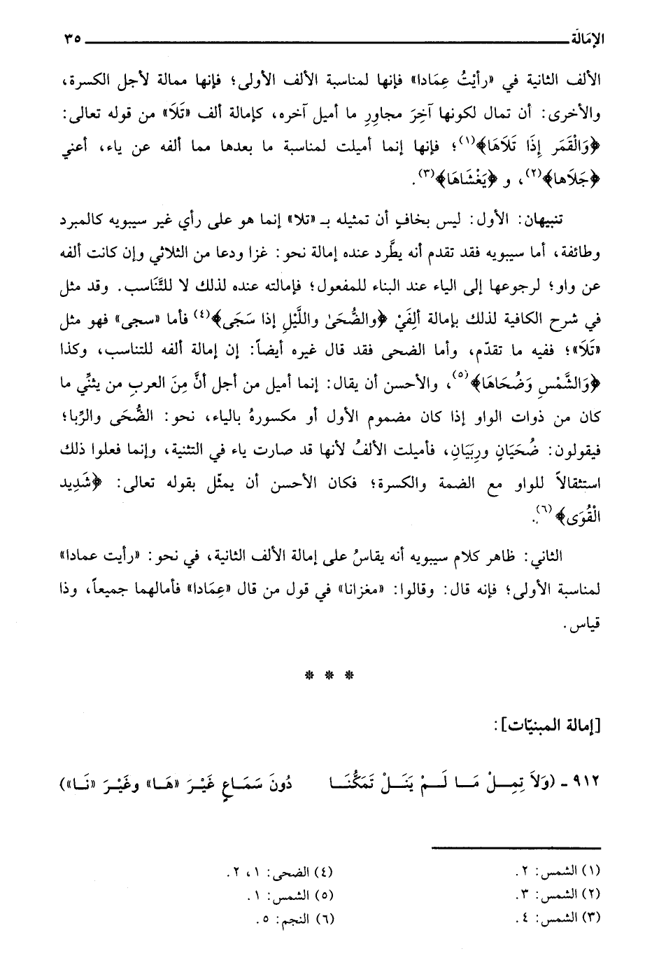تنبيهان: الأول: ليس بخاف أن تمثيله بـ"تلا" إنما هو على رأي غير سيبويه كالمبرد وطائفة، أما سيبويه فقد تقدم أنه يطرد عنده إمالة نحو: غزا ودعا من الثلاثي وإن كانت ألفه عن واو؛ لرجوعها إلى الياء عند البناء للمفعول؛ فإمالته عند لذلك لا لتناسب. وقد مثل في شرح الكافية لذلك بإمالة ألفي {وَالضُّحَى، وَاللَّيْلِ إِذَا سَجَى} 4 فأما "سجى" فهو مثل "تلا"؛ فقيه ما تقدم، وأما الضحى فقد قال غيره أيضا: إن إمالة ألفه للتناسب، وكذا {وَالشَّمْسِ وَضُحَاهَا} 5، والأحسن أن يقال: إنما أميل من أجل أن من العرب من يثني ما كان من ذوات الواو إذا كان مضموم الأول أو مكسورة بالياء، نحو: الضحى والربا؛ فيقولون: ضحيان وربيان، فأميلت الألف لأنها قد صارت ياء في التثنية، وإنما فعلوا ذلك استثقالا للواو مع الضمة والكسرة؛ فكان الأحسن أن يمثل بقوله تعالى: {شَدِيدُ الْقُوَى} 6.
