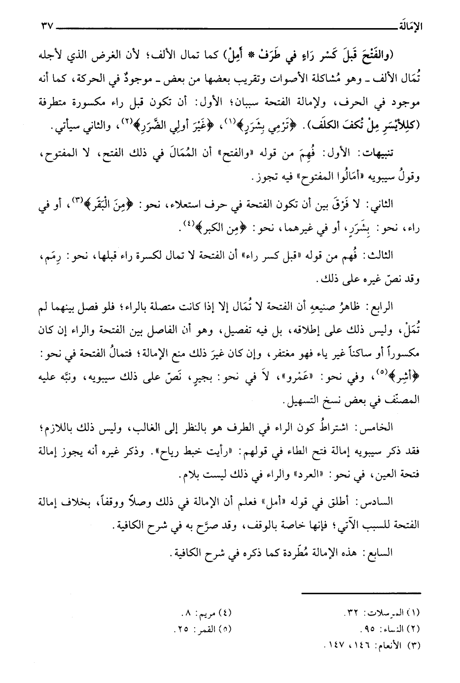 تنبيهات: الأول: فهم من قوله "والفتح: أن الممال في ذلك الفتح، لا المفتوح، وقول سيبويه "أمالوا المفتوح" فيه تجوز.