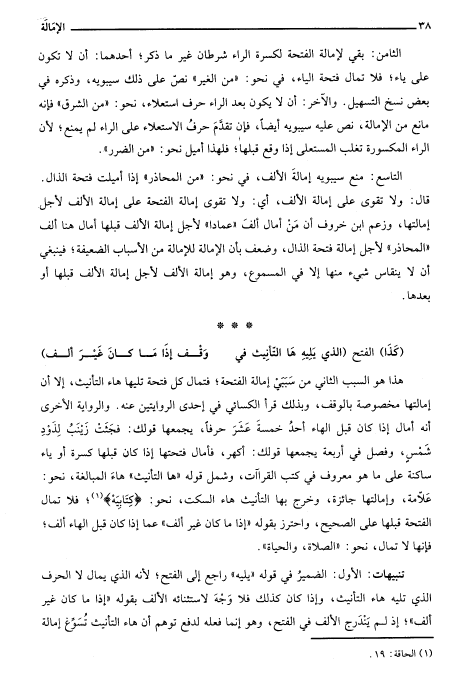 التاسع: منع سيبويه إمالة الألف، في نحو: "من المحاذر" إذا أميلت فتحة الذال. قال: ولا تقوى على إمالة الألف، أي: ولا تقوى إمالة الفتحة على إمالة الألف لأجل إمالتها، وزعم ابن خروف أن من أمال ألف "عمادا" لأجل إمالة الألف قبلها أمال هنا ألف "المحاذر" لأجل إمالة فتحة الذال، وضعف بأن الإمالة للإمالة من الأسباب الضعيفة؛ فينبغي أن لا ينقاس شيء منها إلا في المسموع، وهو إمالة الألف قبلها أو بعدها.
