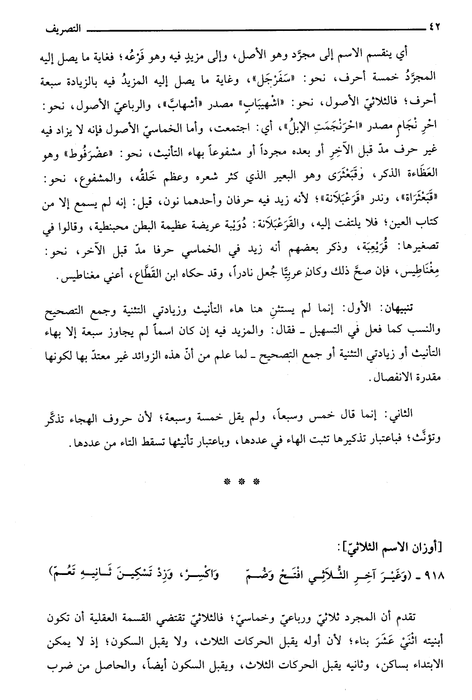تنبيهان: الأول: إنما لم يستثن هنا هاء التأنيث وزيادتي التثنية وجمع التصحيح والنس كما فعل في التسهيل – فقال: والمزيد فيه إن كان اسما لم يجاوز سبعة إلا بهاء التأنيث أو زيادتي التثنية أو جمع التصحيح- لما علم من أن هذه الزوائد غير معتد بها لكونها مقدرة الانفصال.