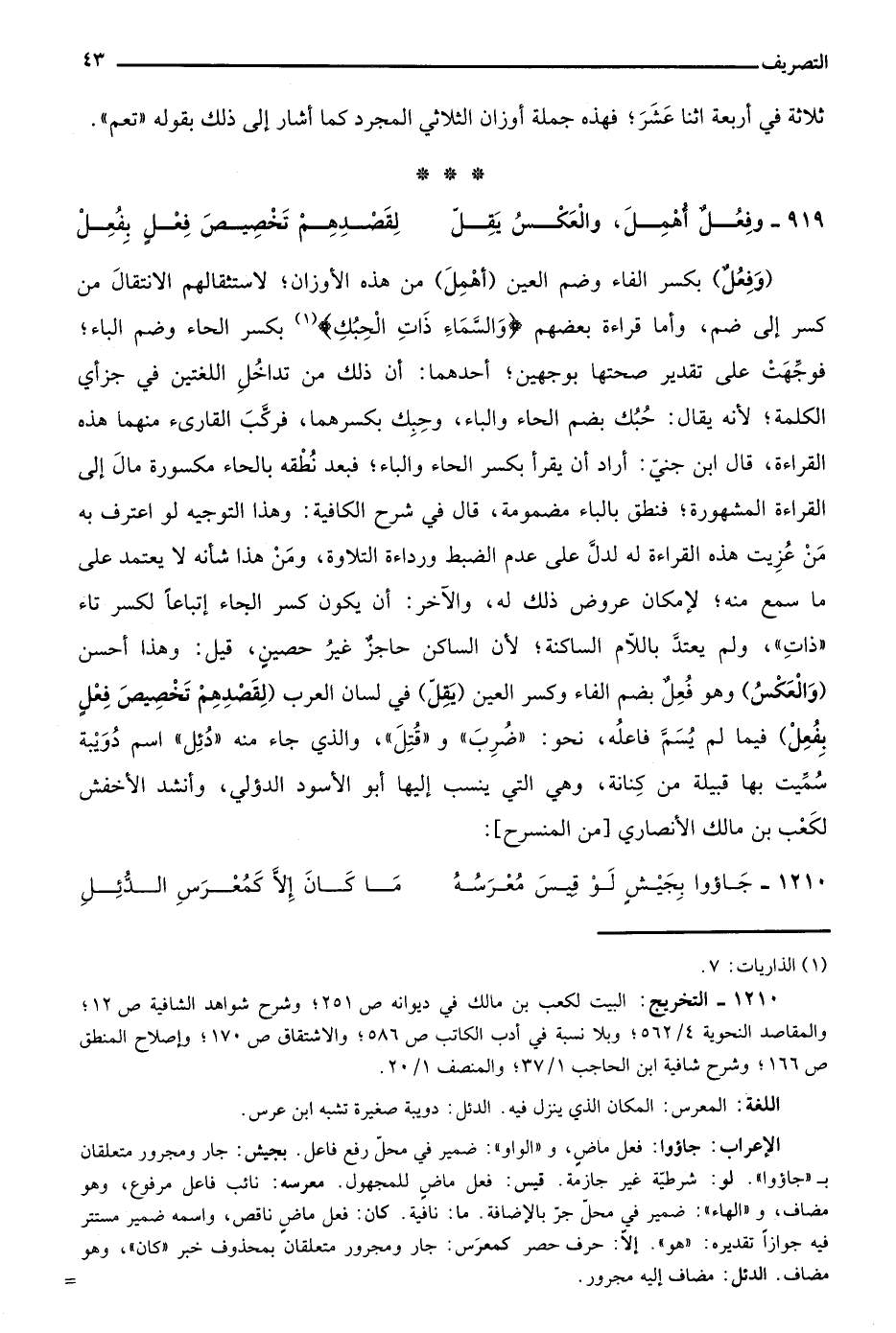 "وفعل" بكسر الفاء وضم العين "أهمل" من هذه الأوزان؛ لاستثقالهم الانتقال من كسر إلى ضم، وأما قراءة بعضهم "وَالسَّمَاءِ ذَاتِ الْحُبُكِ"1 بكسر الحاء وضم الباء؛ فوجهت على تقدير صحتها بوجهين؛ أحدهما: أن ذلك من تداخل اللغتين في جزأي الكلمة؛ لأنه يقال: حبك بضم الحاء والباء، وحبك بكسرهما، فركب القارئ منهما هذه القراءة، قال ابن جني: أراد أن يقرأ بكسر الحاء والباء، فبعد نطقه بالحاء مكسورة مال إلى القراءة المشهورة؛ فنطق بالباء مضمومة، قال في شرح الكافية: وهذا التوجيه لو اعترف به من عزيت هذه القراءة له لدل على عدم الضبط ورداءة التلاوة، ومن هذا شأنه لا يعتمد على ما سمع منه؛ لإمكان عروض ذلك له، والآخر: أن يكون كسر الحاء إتباعا لكسر تاء "ذات"، ولم يعتد باللام الساكنة؛ لأن الساكن حاجز غير حصين، قيل: وهذا أحسن "والعكس" وهو فعل بضم الفاء وكسر العين "يقل" في لسان العرب "لقصدهم تخصيص فعل بفعل" فيما لم يسم فاعله، نحو: "ضرب" و"قتل"، والذي جاء منه "دئل" اسم دويبة سميت بها قبيلة من كنانة، وهي التي ينسب إليها أبو الأسود الدؤلي، وأنشد الأخفش لكعب بن مالك الأنصاري [من المنسرح] :