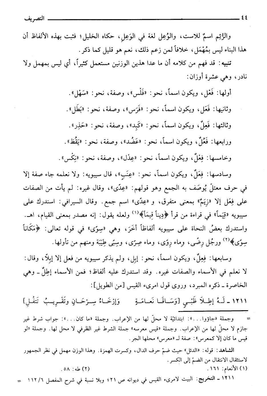 وسادسها: فِعَلٌ، ويكون اسما، نحو: "عنب"، قال سيبويه: ولا نعلمه جاء صفة إلا في حرف معتل يوصف به الجمع وهو قولهم: "عدي"، وقال غيره: لم يأت من الصفات على فعل إلا "زيم" بمعنى متفرق، و"عدي" اسم جمع. وقال السيرافي: استدرك على سيبويه "قيما" في قراءة من قرأ {دِينًا قِيَمًا} 1 ولعله يقول: إنه مصدر بمعنى القيام، ا. هـ. واستدرك بعض النحاة على سيبويه ألفاظا أخر، وهي "سوى" في قوله تعالى: {مَكَانًا سُوًى} 2 ورجل رضى، وماء روى، وماء صرى، وسبي طيبة ومنهم من تأولها.