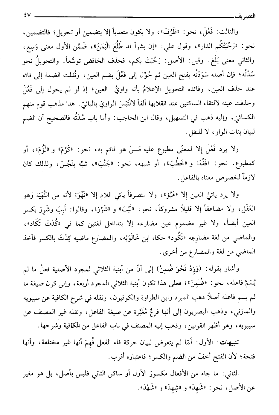 والثالث: فَعُلَ، نحو: "ظرف"، ولا يكون متعديا إلا بتضمين أو تحويل؛ فالتضمين، نحو: "رحبتكم الدار"، وقول علي: "إن بشرًا قد طَلُعَ اليَمَنَ"، ضمن الأول معنى وسع، والثاني معنى بلغ. وقيل: الأصل: رَحُبَتْ بِكُم، فحذف الخافض توسعا. والتحويل نحو سُدْتُه؛ فإن أصله سَوَدْتُه بفتح العين ثم حول إلى فَعُلَ بضم العين، ونقلت الضمة إلى فائه عند حذف العين، وفائدة التحويل الإعلام بأنه واويُّ العين؛ إذ لو لم يحول إلى فعل وحذفت عينه لالتقاء الساكنين عند انقلابها لالتبس الواوي باليائي. هذا مذهب قوم منهم الكسائي، وإليه ذهب في التسهيل، وقال ابن الحاجب: وأما باب سدته فالصحيح أن الضم لبيان بنات الواو، ولا للنقل.