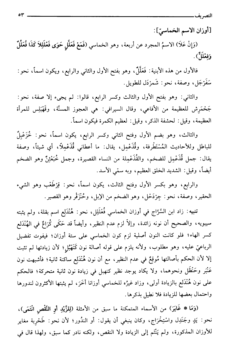 تنبيه: زاد ابن السراج في أوزان الخماسي فعللل، نحو: هندلع اسم بقلة، ولم يثبته سيبويه، والصحيح أن نونه زائدة، وإلا لزم عدم النظير، وأيضا قد حكى كراع في الهندلع كسر ابهاء؛ فلو كانت النون أصلية لزم كون لخماسي على ستة أوزان؛ فيفوت تفضيل الرباعي عليه، وهو مطلوب، ولأنه يلزم على قوله أصالة نون كنهبل؛ لأن زيادتها لم تثبت إلا لأن الحكم بأصالتها موقع في عدم النظير، مع أن نون هندلع ساكنة ثانية؛ فأشبهت نون عنبر وحنظل ونحوهما، ولا يكاد يوجد نظير كنهبل في زيادة نون ثانية متحركة؛ فالحكم على نون هندلع بالزيادة أولى، وزاد غيره للخماسي أوزانا أخر. لم يثبتها الأكثرون لندورها واحتمال بعضها للزيادة فلا تطيل بذكرها.