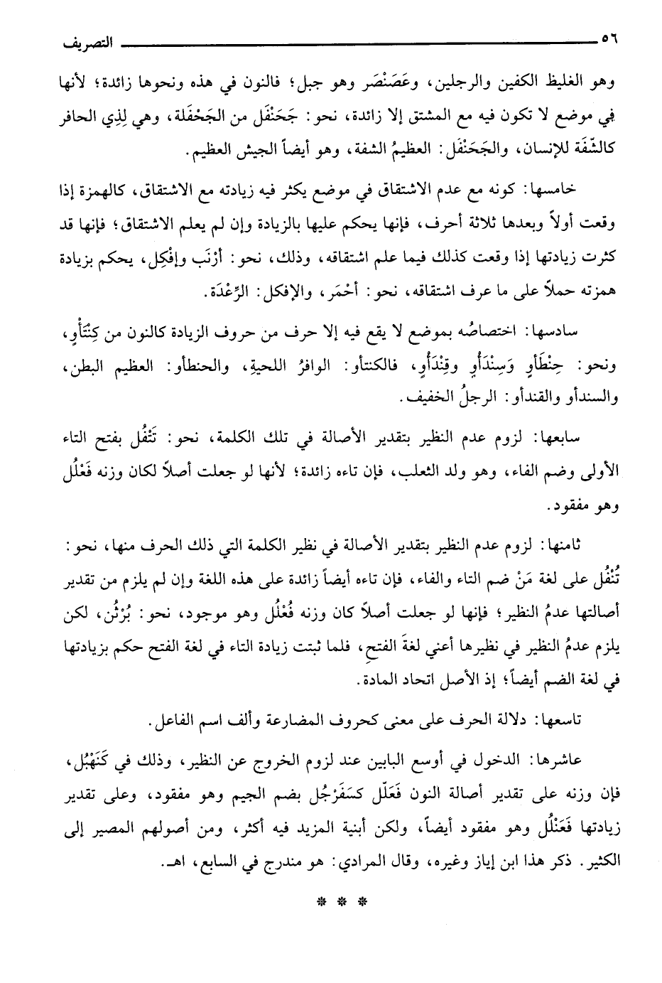 سادسها: اختصاصه بموضع لا يقع فيه إلا حرف من حروف الزيادة كالنون من كنتأو، ونحو: حنطأو وسندأو وقندأو، فالكنتأو: الوافر اللحية، والحنطأو: العظيم البطن، والسندأو والقندأو: الرجل الخفيف.
