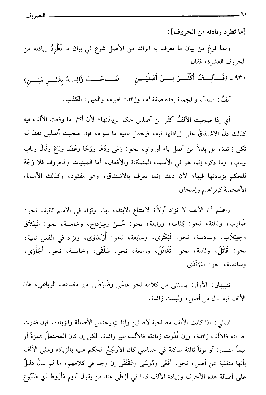 الثاني: إذا كانت الألف مصاحبة لأصلين ولثالث يحتمل الأصالة والزيادة، فإن قدرت أصالته فالألف زائدة، وإن قدرت زيادته فالألف غير زائدة، لكن إن كان المحتمل همزة أو ميما مصدرة أو نونا ثالثة ساكنة في خماسي كان الأرجح الحكم عليه بالزيادة وعلى الألف بأنها منقلبة عن أصل، نحو: أفعى وموسى وعقنقى إن وجد في كلامهم، وما لم يدل دليل على أصالة هذه الأحرف وزيادة الألف كما في أرطى عند من يقول أديم مأروط أي مدبوغ