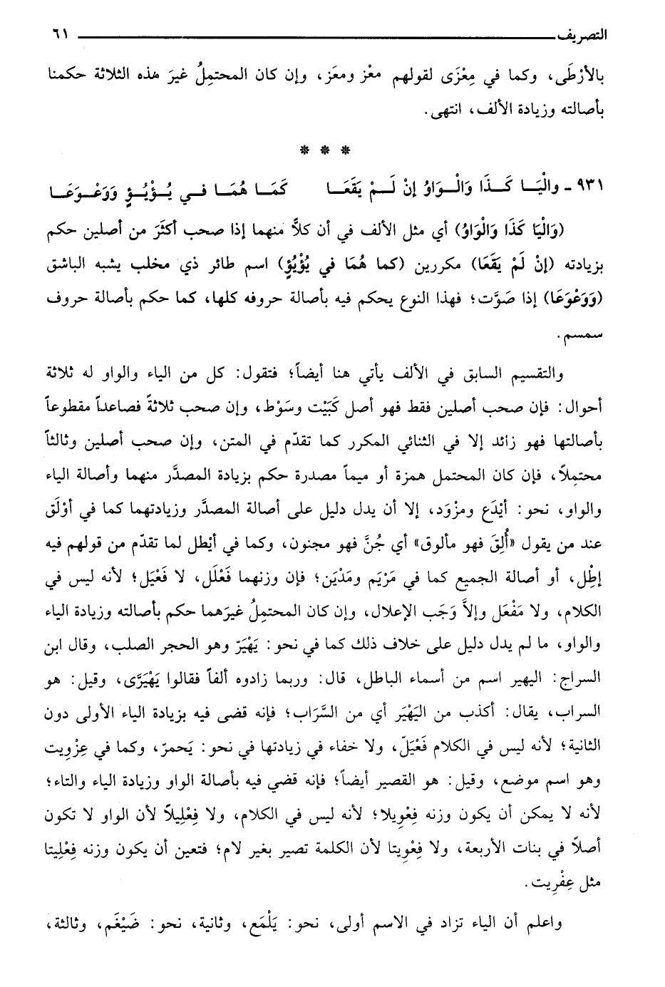 والتقسيم السابق في الألف يأتي هنا أيضا؛ فتقول: كل من الياء والواو له ثلاثة أحوال: فإن صحب أصلين فقط فهو أصل كبيت وسوط، وإن صحب ثلاثة فصاعدا مقطوعا بأصالتها فهو زائد إلا في الثنائي المكرر كما تقدم في المتن، وإن صحب أصلين وثالثا محتملا، فإن كان المحتمل همزة أو ميما مصدره حكم بزيادة المصدر منهما وأصالة الياء والواو، نحو: أيدع ومزود، إلا أن يدل دليل على أصالة المصدر وزيادتهما كما في أولق عند من يقول "ألق فهو مألوق" أي جن فهو مجنون، وكما في أيطل لما تقدم من قولهم فيه إطل، أو أصالة الجميع كما في مريم ومدين؛ فإن وزنهما فعلل، لا فعيل؛ لأنه ليس في الكلام، ولا مفعل وإلا وجب الإعلال، وإن كان المحتمل غيرهما حكم بأصالته وزيادة الياء والواو، مالم يدل دليل على خلاف ذلك كما في نحو: يهير وهو الحجر الصلب، وقال ابن السراج: اليهير اسم من أسماء اليهير أي من السراب؛ فإنه قضى فيه يزيادة الياء الأولى دون الثانية؛ لأنه ليس في الكلام فعيل، ولا خفاء في زيادتها في نحو: يحمر، وكما في عزويت وهو اسم موضع، وقيل: هو القصير أيضا؛ فإنه قضي فيه بأصالة الواو وزيادة الياء والتاء؛ لأنه لا يمكن أن يكون وزنه فعويلا؛ لأنه ليس في الكلام، ولا فعليلا لأن الواو لا تكون أصلا في بنات الأربعة، ولا فعويتا لأن الكلمة تصير بغير لام؛ فتعين أن يكون وزنه فعليتا مثل عفريت.