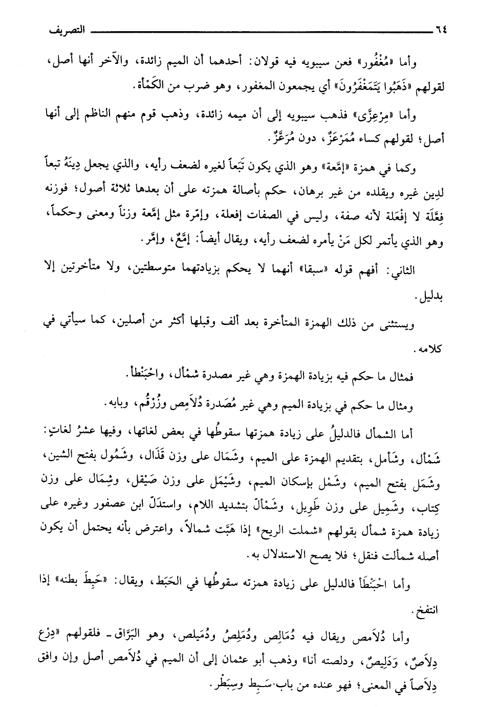 وكما في همزة "إمعة" وهو الذي يكون تبعا لغير لضعف رأيه، والذي يجعل دينه تبعا لدين غيره ويقلده من غير برهان، حكم بأصالة همزته على أن بعدها ثلاثة أصول؛ فوزنه فعلة لا إفعلة لأنه صفة، وليس في الصفات إفعلة، وأمرة مثل إمعة وزنا ومعنى وحكما، وهو الذي يأتمر لكل من يأمره لضعف رأيه، ويقال أيضا: إمع، وإمر.