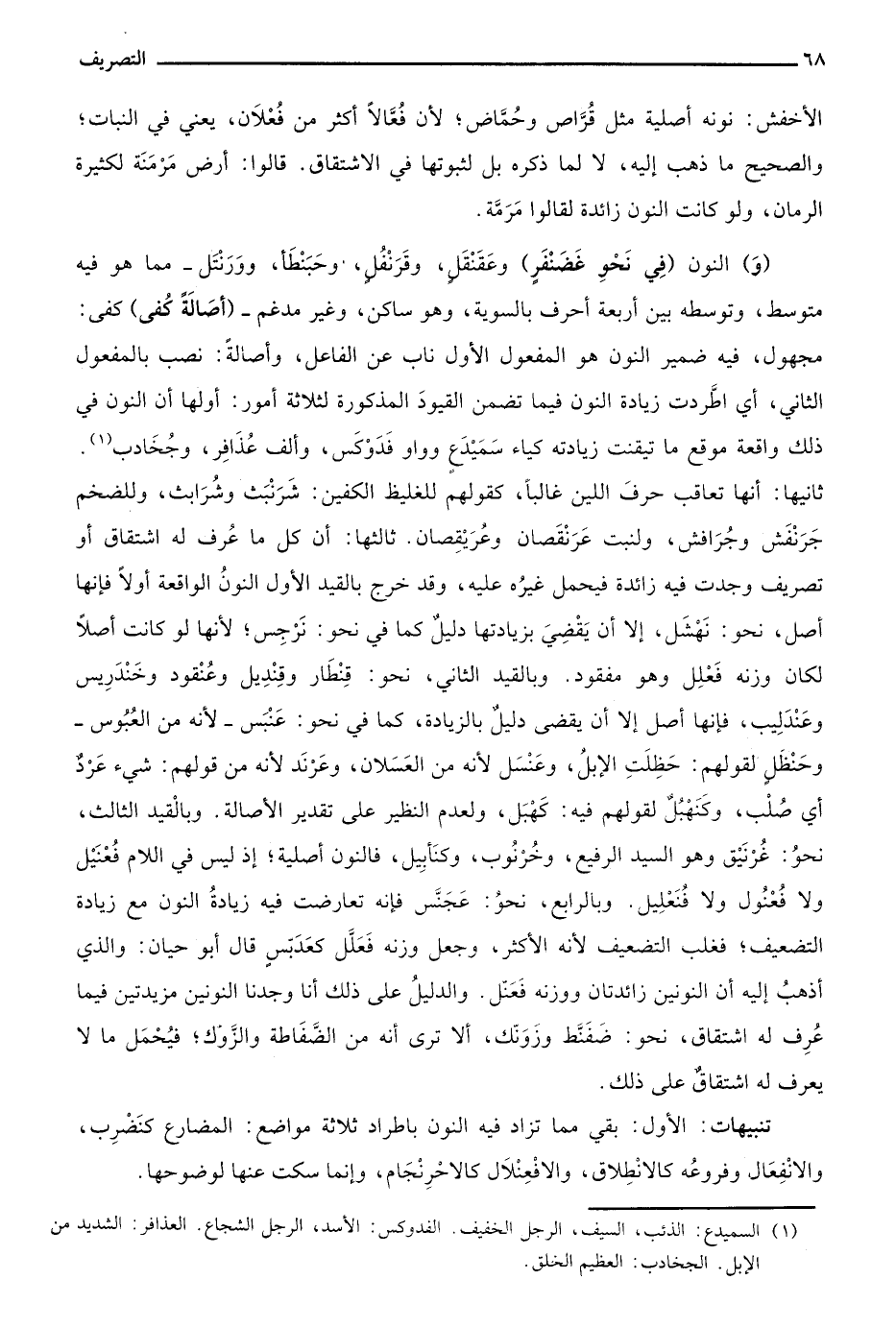 "و" النون "في نحو غضنفر" وعقنقل، وقرنفل، وحبنطأ، وورنتل –مما هو فيه متوسط، وتوسطه بين أربعة أحرف بالسوية، وهو ساكن، وغير مدغم– "أصالة كفي" كفي: مجهول، فيه ضمير النون هو المفعول الأول ناب عن الفاعل، وأصالة: نصب بالمفعول الثاني، أي أطردت زيادة النون فيما تضمن القيود المذكورة لثلاثة أمور: أولها أن النون في ذلك واقعة موقع ما تيقنت زيادته كياء سميدع وواو فدوكس، وألف عذافر، وجخادب1. ثانيها: أنها تعاقب حرف اللين غالبا، كقولهم للغليظ الكفين: شرنبث وشرابث، وللضخم جرنفش وجرافش، ولنبت عرنقصان وعريقصان. ثالثها: أن كل ما عرف له اشتقاق أو تصريف وجدت فيه زائدة فيحمل غير عليه، وقد خرج بالقيد الأول النون الواقعة أولا فإنها أصل، نحو: نهشل، إلا أن يقضي بزيادتها دليل كما في نحو: نرجس؛ لأنها لوكانت أصلا لكان وزنه فعلل وهو مفقود. وبالقيد الثاني، نحو: قنطار وقنديل وعنقود وخندريس وعندليب، فإنها أصل إلا أن يقضي دليل بالزيادة، كما في نحو: عنبس –لأنه من العبوس_ وحنظل لقولهم: حظلت الإبل، وعنسل لأنه من العسلان، وعرند لأنه من قولهم: شيء عرد أي صلب، وكنهبل لقولهم فيه: كهبل، ولعدم النظير على تقدير الأصالة. وبالقيد الثالث، نحو: غرنيق وهو السيد الرفيع، وخرنوب، وكنأبيل، فالنون أصلية؛ إذ ليس في اللام فعنيل ولا فعنول ولا فنعليل. وبالرابع، نحو: عجنس فإنه تعارضت فيه زيادة النون مع زيادة التضعيف؛ فغلب التضعيف لأنه الأكثر، وجعل وزنه فعلل كعدبس قال أبو حيان: والذي أذهب إليه أن النونين زائدتان ووزنه فعنل. والدليل على ذلك أنا وجدنا النونين مزيدتين فيما عرف له اشتقاق، نحو: ضفنط وزونك، ألا ترى أنه من الضفاطة والزوك؛ فيحمل ما لا يعرف له اشتقاق على ذلك.