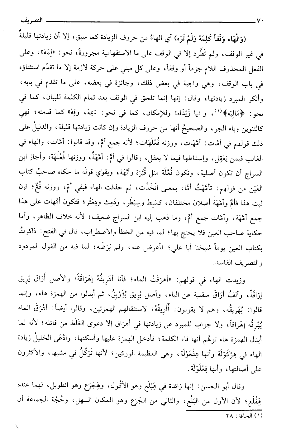 وزيدت الهاء في قولهم: "أهرقت الماء؛ فأنا أهريقه إهراقة" والأصل أراق يريق إراقة، وألف أراق منقلبة عن الياء، وأصل يريق يؤريق، ثم أبدلوا من الهمزة هاء، وإنما قالوا: يهريقه، وهو لا يقولون: أأريقه؛ لاستثقالهم الهمزتين، وقالوا أيضا: أهرق الماء يهرقه إهراقا، ولا جواب للمبرد عن زيادتها في أهراق إلا دعوى الغلط من قائله؛ لأنه لما أبدل الهمزة هاء توهم أنها فاء الكلمة؛ فأدخل الهمزة عليها وأسكنها، وادعى الخليل زيادة الهاء في هركولة وأنها هفعولة، وهي العظيمة الوركين؛ لأنها تركل في مشيها، والأكثرون على أصالتها، وأنها فِعَْلَوَْلَة.