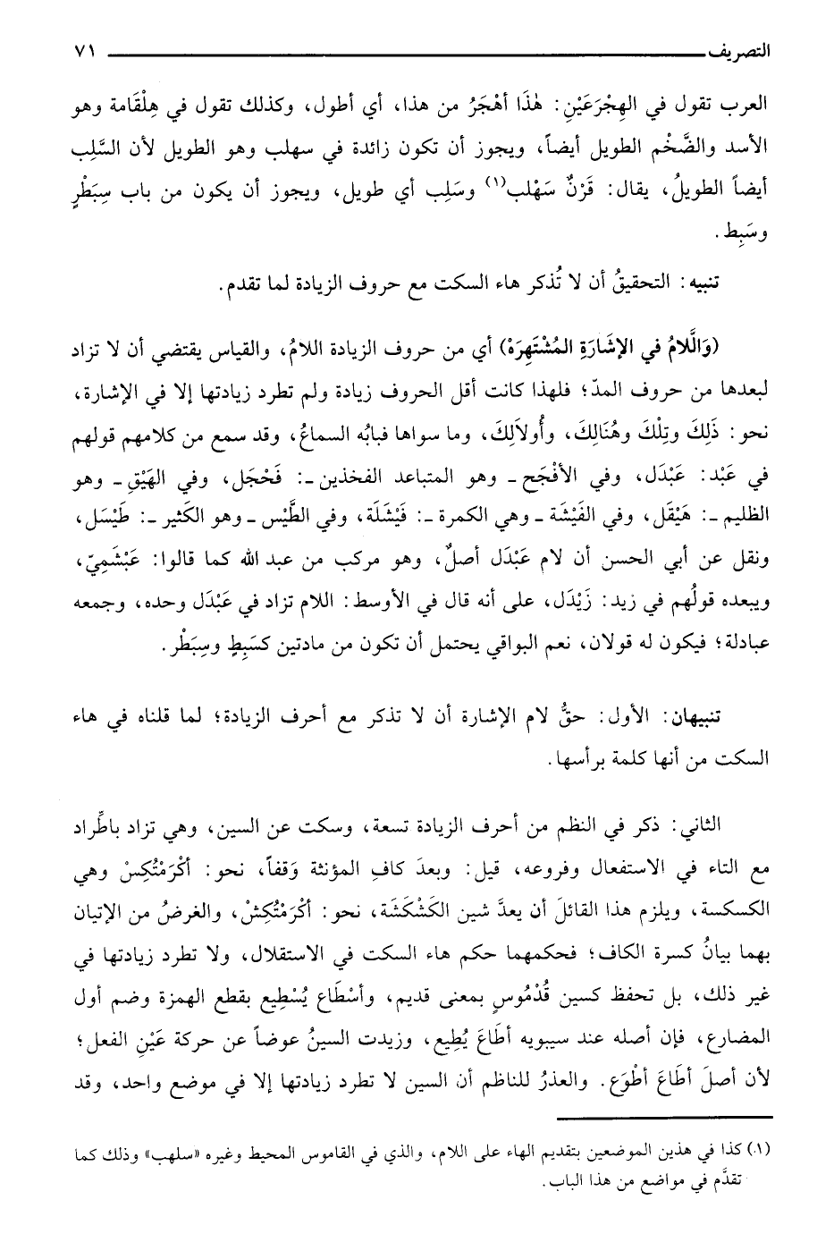 "وَاللاَّمُ فِي الإشَارَةِ المُشْتَهِرَهْ" أي من حروف الزيادة واللام، والقياس يقتضي أن لا تزاد لبعدها من حروف المد؛ فلهذا كانت أقل الحروف زيادة ولم تطرد زيادتها إلا في الإشارة، نحو: ذلك وتلك وهناك، وأُولَالِك، وما سواها فبابه السماع، وقد سمع من كلامهم قولهم في عبد: عبدل، وفي الأفجح –وهو المتباعد الفخذين-: فحجل، وفي الهيق- وهو الظليم-: هيقل، وفي الفيشة –وهي الكمرة-: فيشلة، والطيس –وهو الكثير-: طيسل، ونقل عن أبي الحسن أن لام عبدل أصل، وهو مركب من عبد الله كما قالوا: عبشمي، ويبعده قولهم في زيد: زيدل، على أنه قال في الأوسط: اللام تزاد في عبدل وحده، وجمعه عبادلة؛ فيكون له قولان، نعم البواقي يحتمل أن تكون من مادتين كسبط وسبطر.