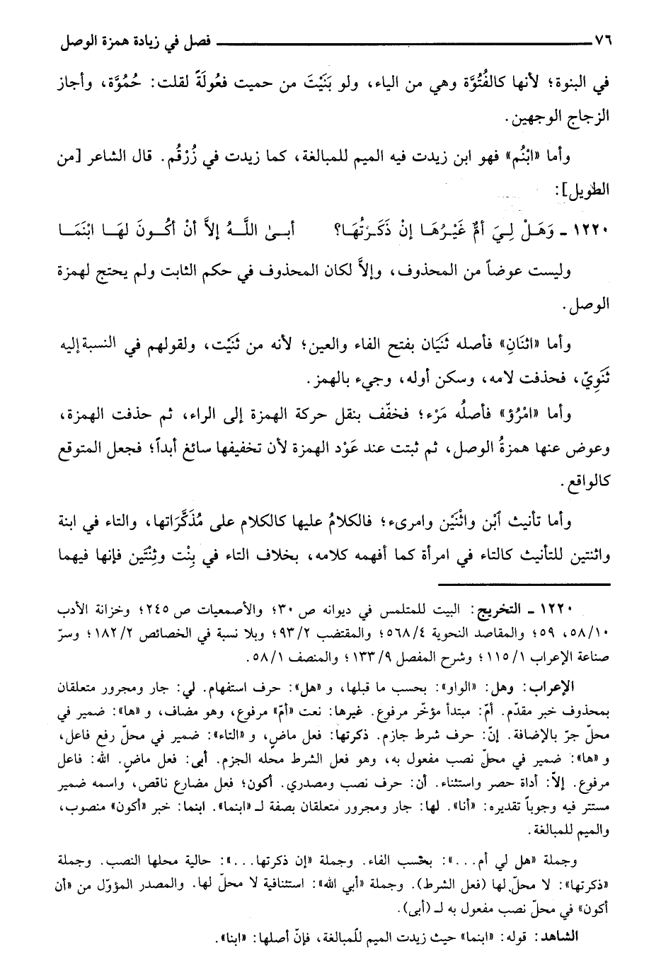 الإعراب: وهل: "الواو": بحسب ما قبلها، و"هل": حرف استفهام. لي: جار ومجرور متعلقان بمحذوف خبر مقدم. أم: مبتدأ مؤخر مرفوع. غيرها: نعت ماض، و"التاء": ضمير في محل رفع فاعل، و"ها": ضمير في محل نصب مفعول به، وهو فعل الشرط محله الجزم. أبي: فعل ماض. الله: فاعل مستتر فيه وجوبا تقديره: "أنا". لها: جار ومجرور متعلقان بصفة لـ"ابنما": خبر "أكون" منصوب، والميم للمبالغة.