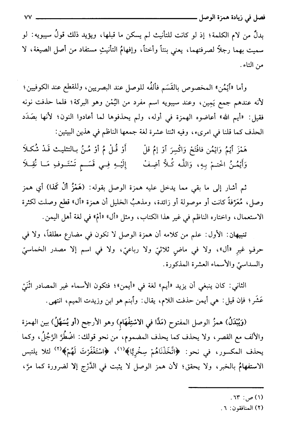تنبيهان: الأول: علم من كلامه أن همزة الوصل لا تكون في مضارع مطلقا، ولا في حرف غير "أل"، ولا في ماض ثلاثي ولا رباعي، ولا في اسم إلا مصدر الخماسي والسداسي والأسماء العشرة المذكورة.