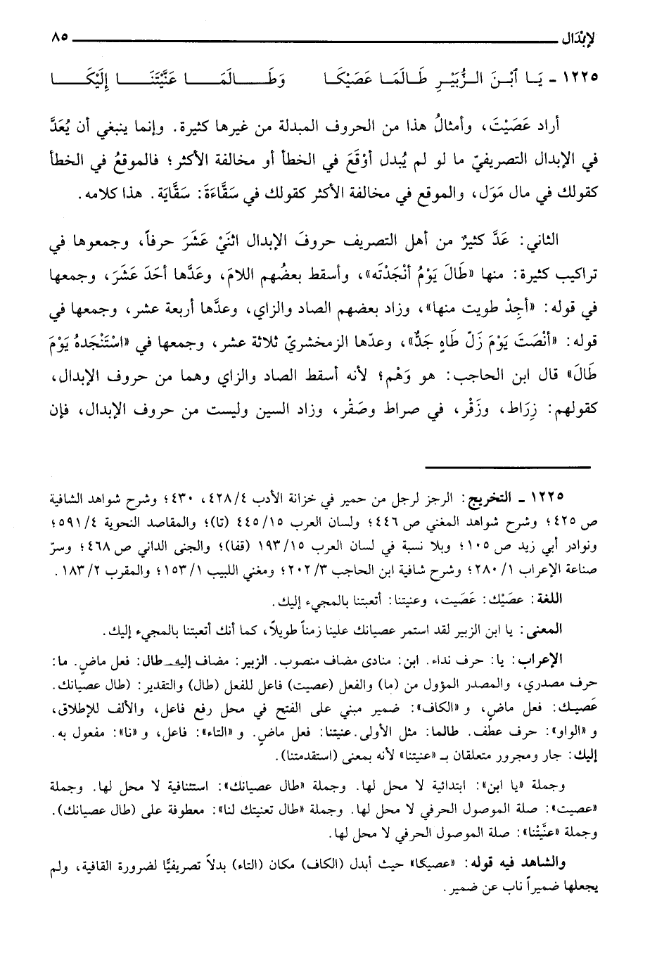 الإعراب: يا: حرف نداء. ابن: منادى مضاف منصوب. الزبير: مضاف إليه طال: فعل ماض. ما: حرف مصدري، والمصدر المؤول من "ما" والفعل "عصيت" فاعل للفعل "طال" والتقدير: "طال عصيانك. عصيك: فعل ماض، و"الكاف": ضمير مبني على الفتح في محل رفع فاعل، والألف للإطلاق، و"الواو": حرف عطف. طالما: مثل الأولى. عنيتنا: فعل ماض. و"التاء": فاعل، و"نا": مفعول به إليك: جار ومجرور متعلقان بـ"عنيتنا" لأنه بمعنى "استقدمتنا".