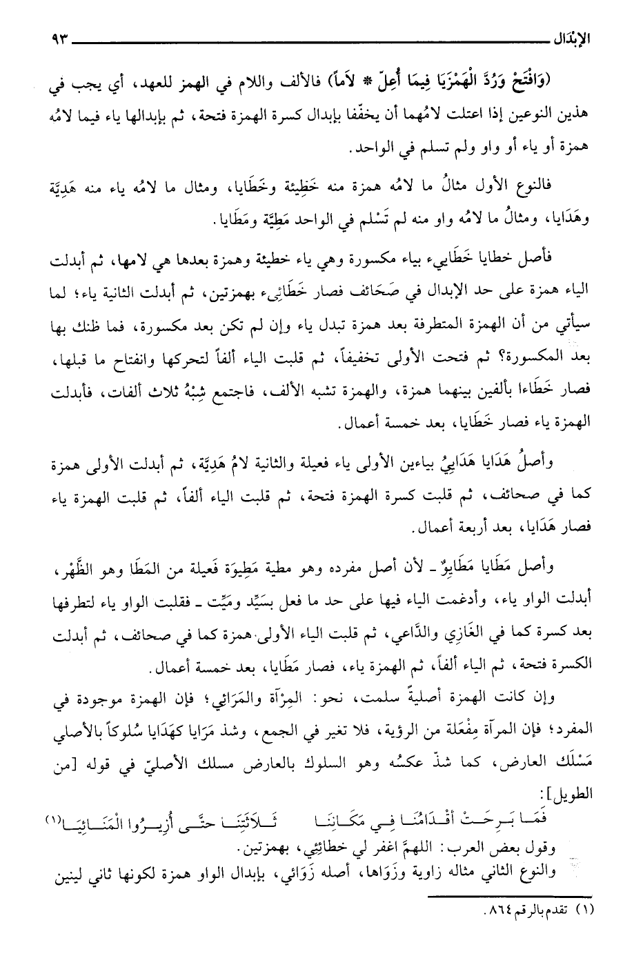 وأصل مطايا مطايو –لأن أصل مفرده وهو مطية مطيوة فعيلة من المطا وهو الظهر، أبدلت الواو ياء، وأدغمت الياء فيها على حد ما فعل بسيد وميت- فقلبت الواو ياء لتطرفها بعد كسرة كما في الغازي والداعي، ثم قلبت الياء الأولى همزة كما في صحائف، ثم أبدلت الكسرة فتحة، ثم الياء ألفا، ثم الهمزة ياء، فصار مطايا، بعد خمسة أعمال.