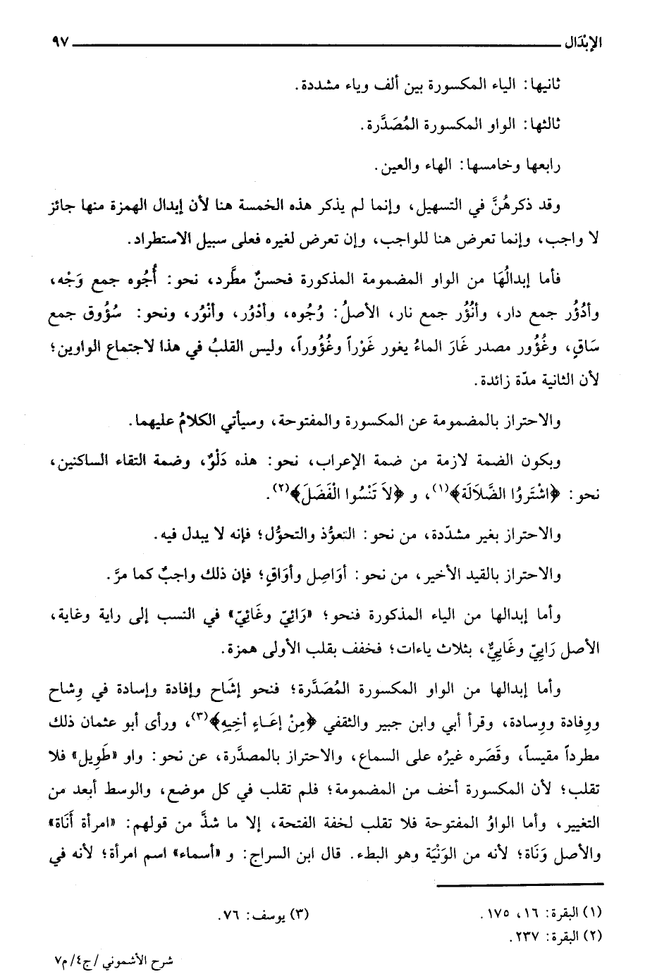 وأما إبدالها من الواو المكسورة المصدرة؛ فنحو إشاح وإفادة وإسادة في وشاح ووفادة ووسادة، وقرأ أبي وابن جبير والثقفي "مِنْ إِعَاءِ أَخِيهِ"3، ورأى أبو عثمان ذلك مطردا مقيسا، وقصره غيره على السماع، والاحتراز بالمصدرة، عن نحو: واو "طويل" فلا تقلب؛ لأن المكسورة أخف من المضمومة؛ فلم تقلب في كل موضع، والوسط أبعد من التغيير، وأما الواو المفتوحة فلا تقلب لخفة الفتحة، إلا ما شد من قولهم: "امرأة أناة" والأصل وناة؛ لأنه من الونية وهو البطء. قال ابن السراج: و"أسماء" اسم امرأة؛ لأنه في